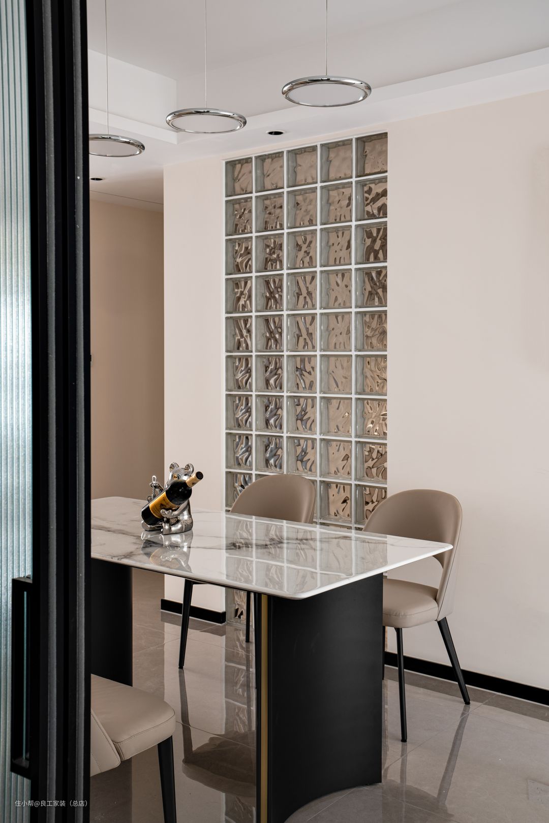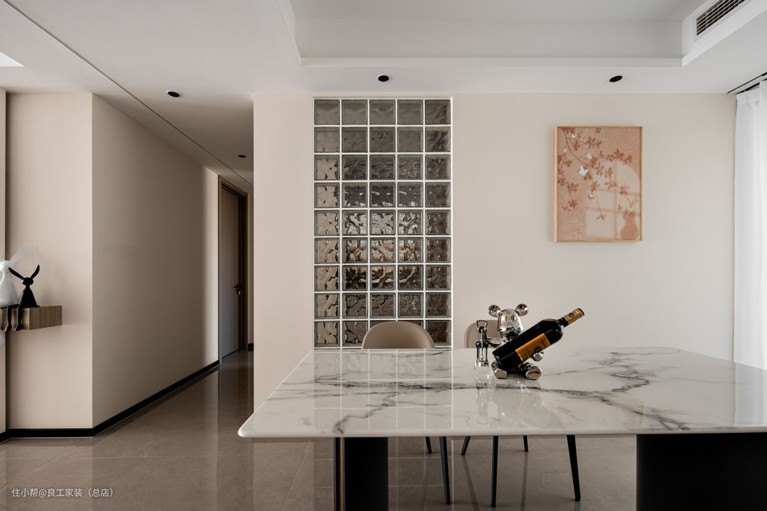 客餐厅联通成一个开放明媚的空间,以开放式设计为主轴导引充沛日光走入室内,整个公区空间显得尤为通透敞亮。玻璃砖的融入,赋予家灵动的特质,其独有的光影装饰性成为就餐空间的时髦焦点。同时其强烈的光线穿透力让空间变得格外通透。餐边收纳柜与背景墙结合成一体,让整体空间更加简洁干净,一抹浓郁温柔的奶油色游走于室内每一隅。