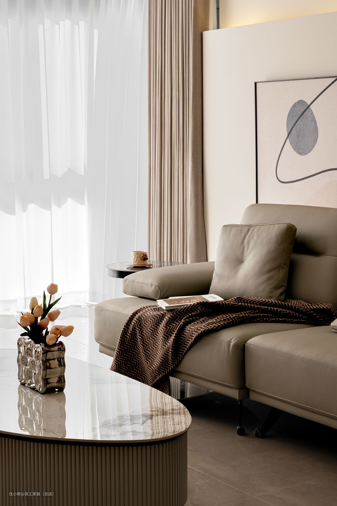 全屋以奶油色为基底,局部融入原木饰面,流露出温润氛围,配合着奶咖色系的软装家具,让色彩趋于浓郁饱和,这个家呈现出简净舒雅的居室气质。沙发背景墙经过造型处理,留白与原木相叠加,一定程度丰富了空间层次和细节,打破固有呆板印象,为客厅注入了灵动艺术之美。把阳台纳入室内,增加室内客厅面积的同时,延展了视觉舒适性。