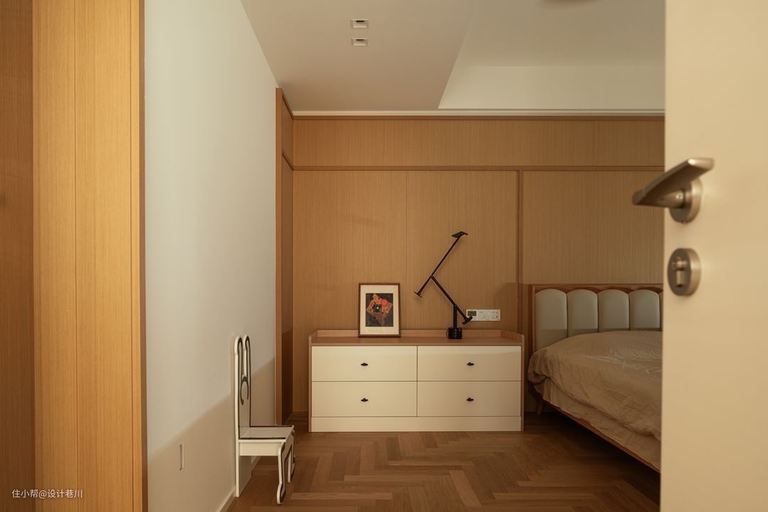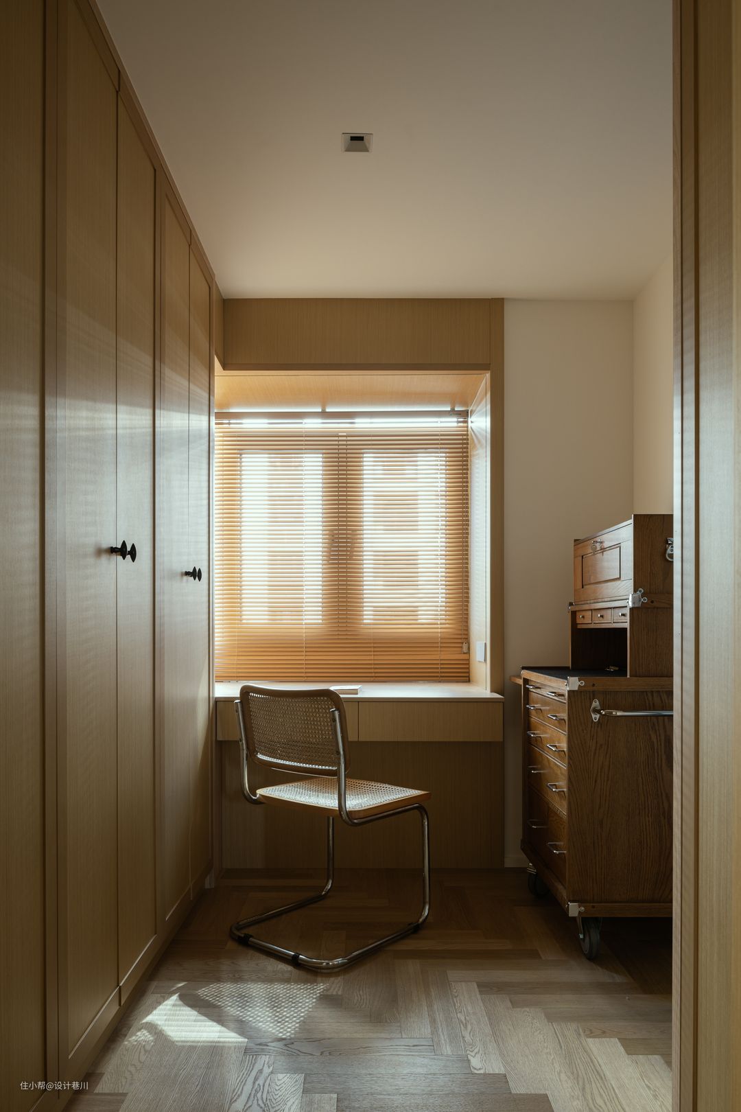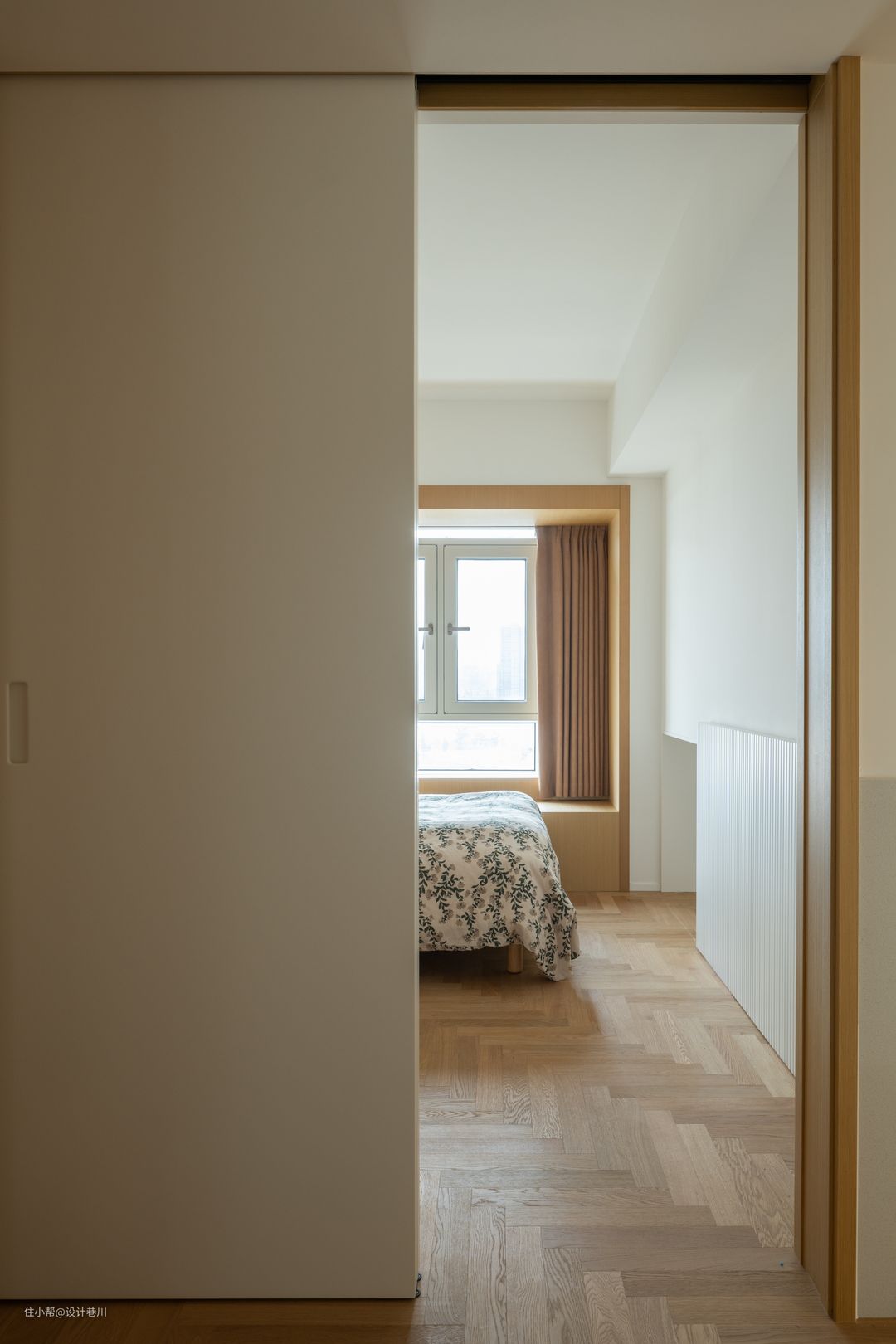 人字拼小板是屋主武汉的法式家里也有的元素,屋主也表示在原本的家里用习惯了,希望可以沿用到新家。与法式家稍有不同,我们选用了更浅的橡木色,以配合全屋的色调。铺设方式上,也选择了沿着墙面呈直角铺设,视觉上不“抢”,更适配原木风格的家。 卧室扩大后,形成了「卧室—衣帽间—主卫」的套间格局,空间也不再局促,放下大床和婴儿床的同时也依然有充裕的活动空间。 空间变大的副作用就是显得“不聚气”,人睡在空间里没有了安全感。为了解决这个问题,我们用木饰面将整个睡眠区域包裹起来,用稍暗的色调,营造一个没有墙的小空间。 飘窗整体也做了窗套,坐、卧、躺、靠都会更加舒适。