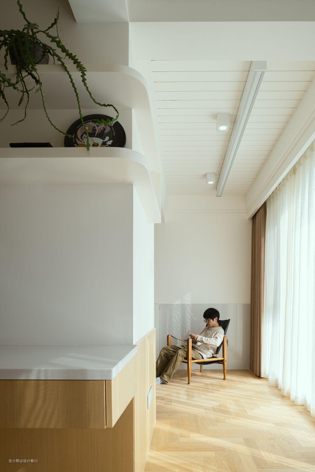 客厅的定制沙发是这次设计的亮点之一。 由于承重墙的存在,这块区域存在难以解决的卫生死角,我们选择用木作打造「沙发—书桌一体功能区」来解决这个问题。 沙发深度足有0.9米,不仅可以放心让孩子在沙发上玩,也能作为小憩时的沙发床使用。 坐垫材质为高密度海绵,高度、硬度、花色都可以随心定制。 沙发一侧做了矮柜,落地和推拉门设计是为了吸引孩子来使用它。 与其强迫孩子学习整洁和收纳,不如在环境中让他受到潜移默化的影响。出于这样的考虑,我们在全屋空间中安排了多处这样的「彩蛋」。 沙发背后是长达3米的书桌,足够夫妻俩人同时使用。考虑到重度电子产品使用场景,我们预留了多处插座。 回归到屋主最基础的看护需求,当屋主坐在书桌后,他可以通过微调自己的座位,观察到公区的情况。 阳台一侧被承重墙遮挡,从客厅和书房都难以窥见,无论是放置吸尘器、晾衣架,还是作为休闲区都可以。考虑到未来的需求,我们在这一侧也加装了插座。 屋主两人不看电视,于是电视墙就做成了书柜。随着孩子慢慢长大,这里将被绘本填满。