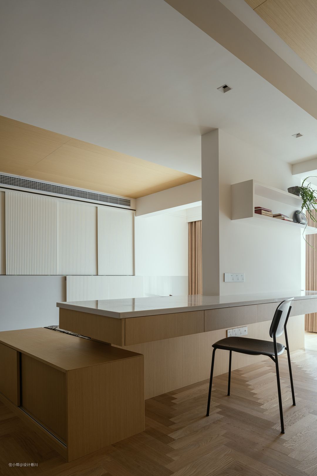 进门第一眼,是宽敞的客厅和开放式书房。 顶部的木饰面和白色吊顶将客厅和书房划分成大小相近的三个功能区,把大空间做“小”,不显空旷。吊顶还很好地隐藏了灯带和射灯,实现无主灯设计,一举两得。 考虑到入户大门外还有个玄关柜,室内没有再做换鞋区。但次净衣和换季鞋还是要入户。 我们沿着墙体做了一个长达4米深度将近0.8米的储物库,相当于一个变形「800库」,柜子内加装可调节收纳系统。 一般衣柜的进深为0.6米,我们却做到了0.8米,一方面考虑的是屋主一家换季杂物、四个大行李箱以及婴儿车的存放问题,另一方面也是为了与阳台柜拉齐,弱化垭口的存在感。