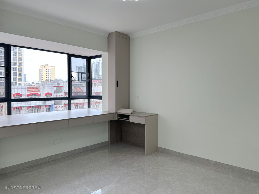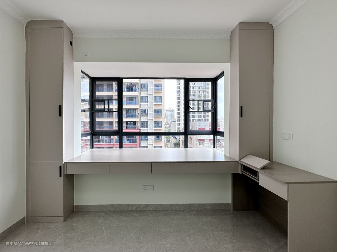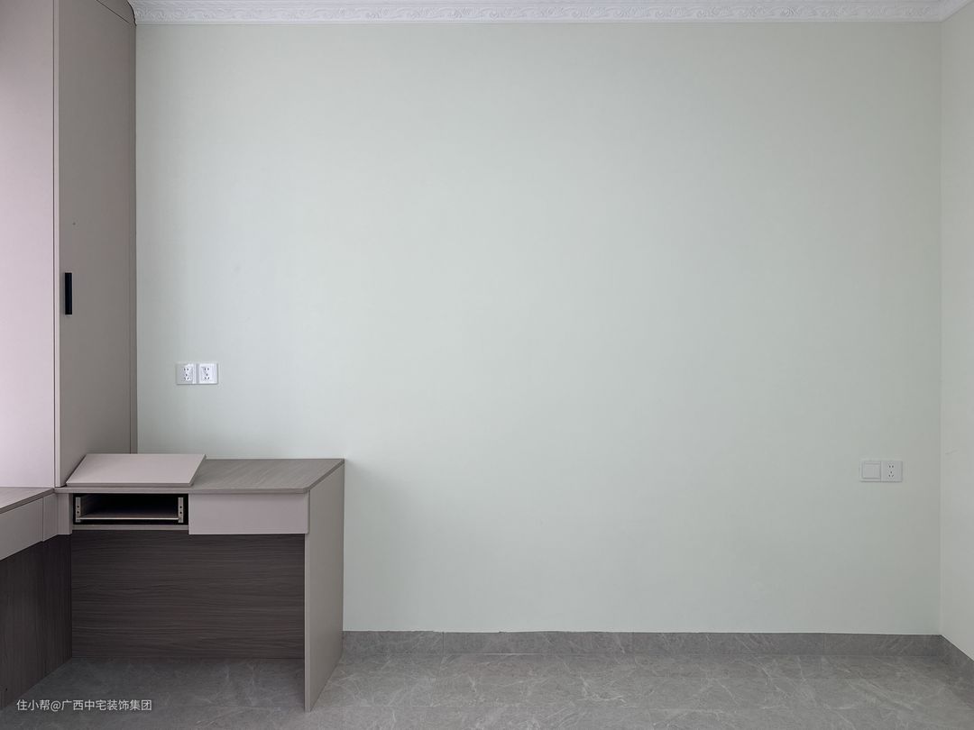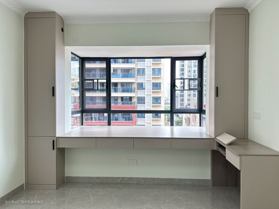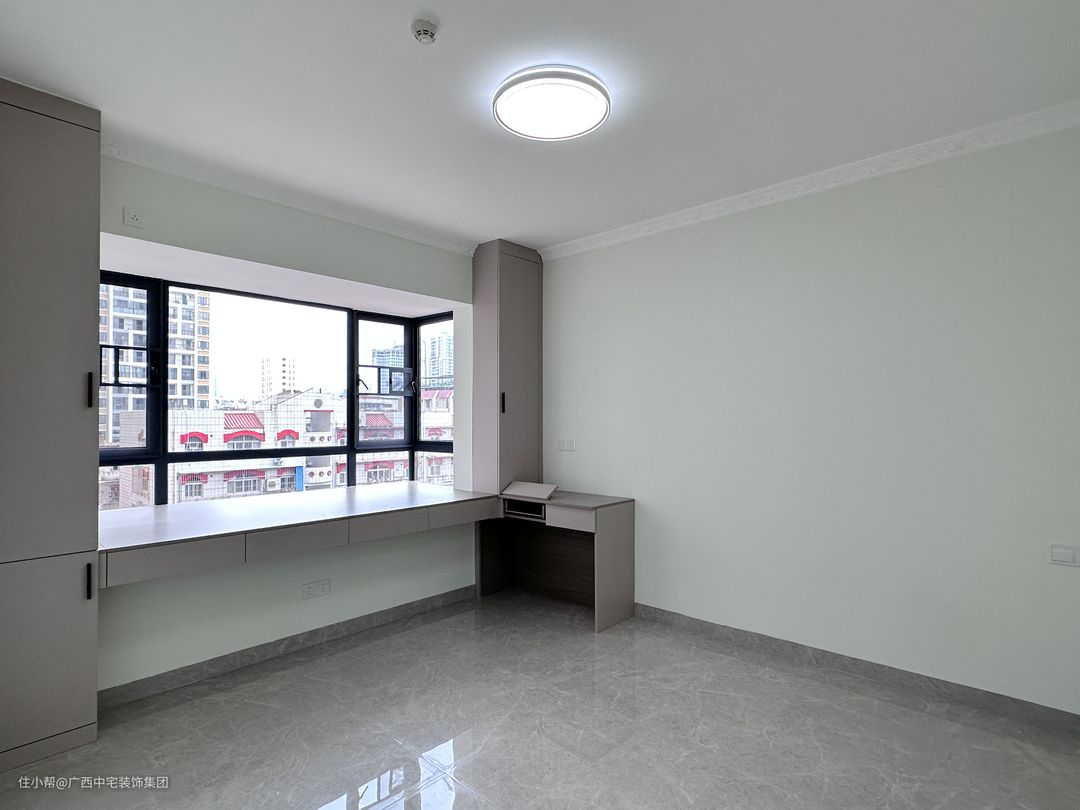 主卧以整体色调为基准,以灰白色为画笔,勾勒出一个优雅恬静的氛围。飘窗处一体化定制储物柜书桌化妆台,集多功能为一体,好办公,精致妆容,收纳日常物品,便捷化生活齐聚一堂,化身助力小能手。飘窗引光入内,叫醒沉睡中的我们,感受一天的美好。