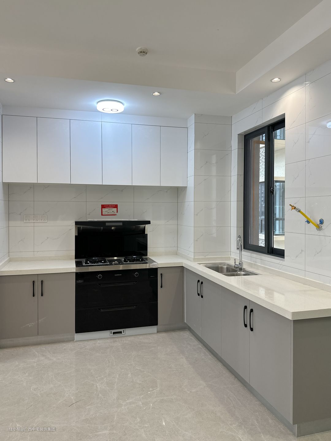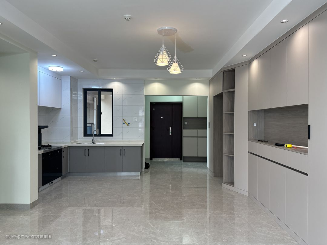 厨房开而烹饪,集聚烹饪的乐趣与互动性,让烹饪区更有烟火气。L型橱柜,包纳烹饪食材和厨具,让空间整洁有序,告别了脏脏的环境。大理石台面,是为了守护一方美食,其使用时间长,耐磨耐脏,化身守护大师。而集成灶+抽油烟机则是另一个烹饪赛道,大火烹饪,无油烟困扰,烹饪出一道道色香味俱全的美食。