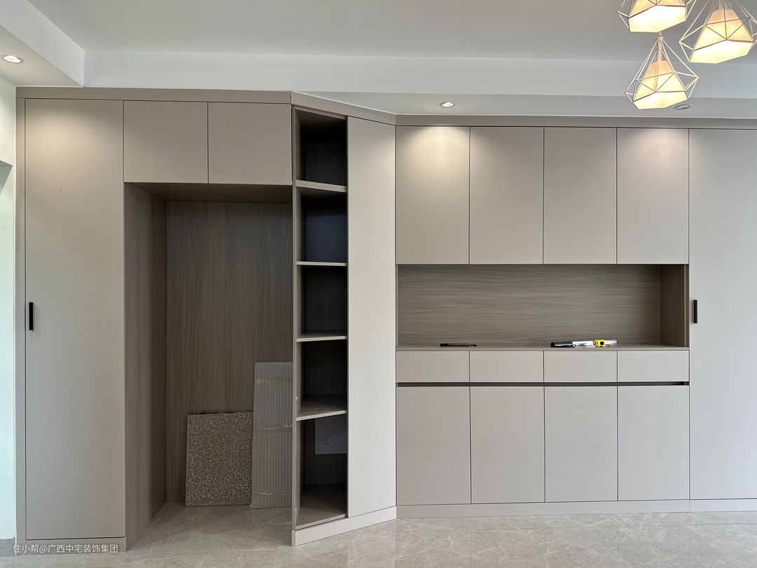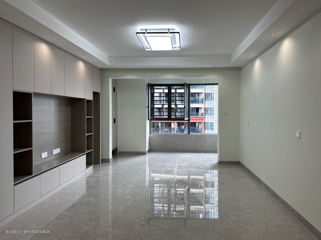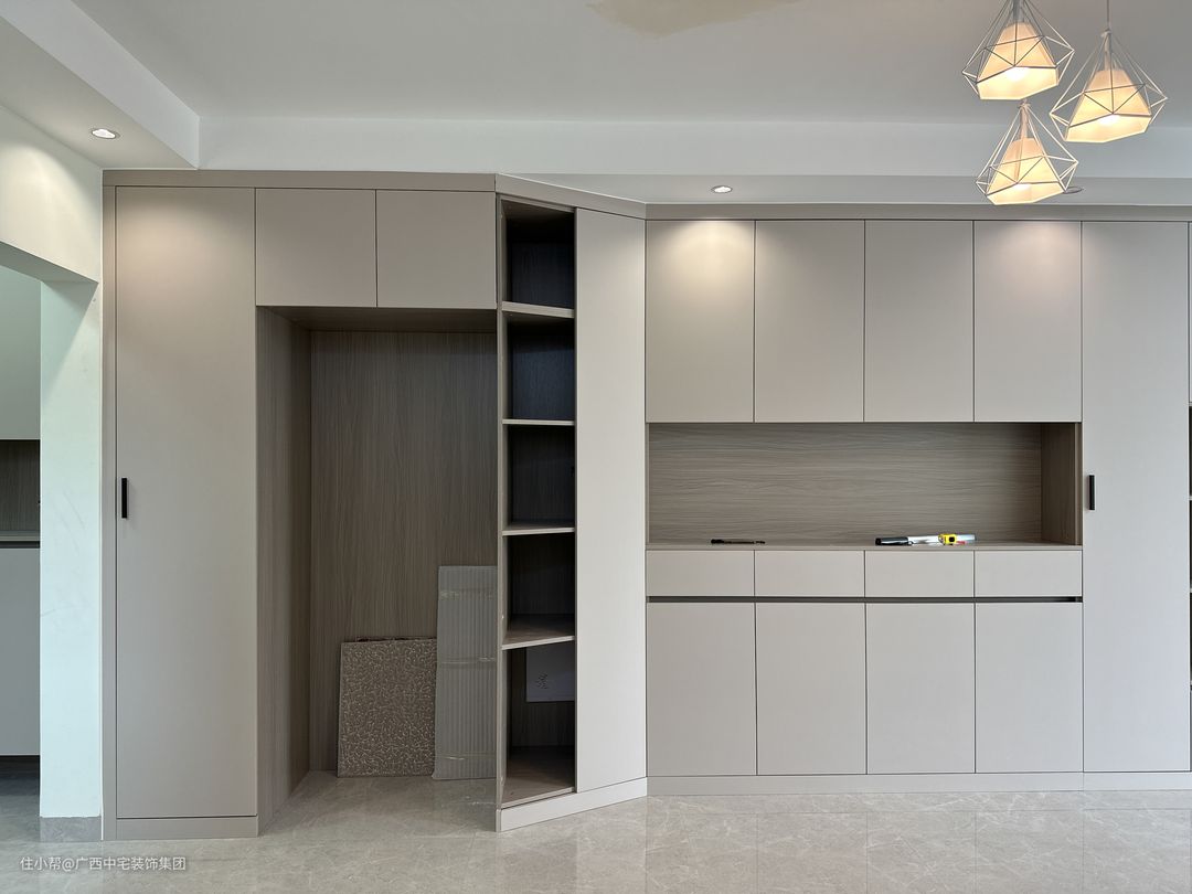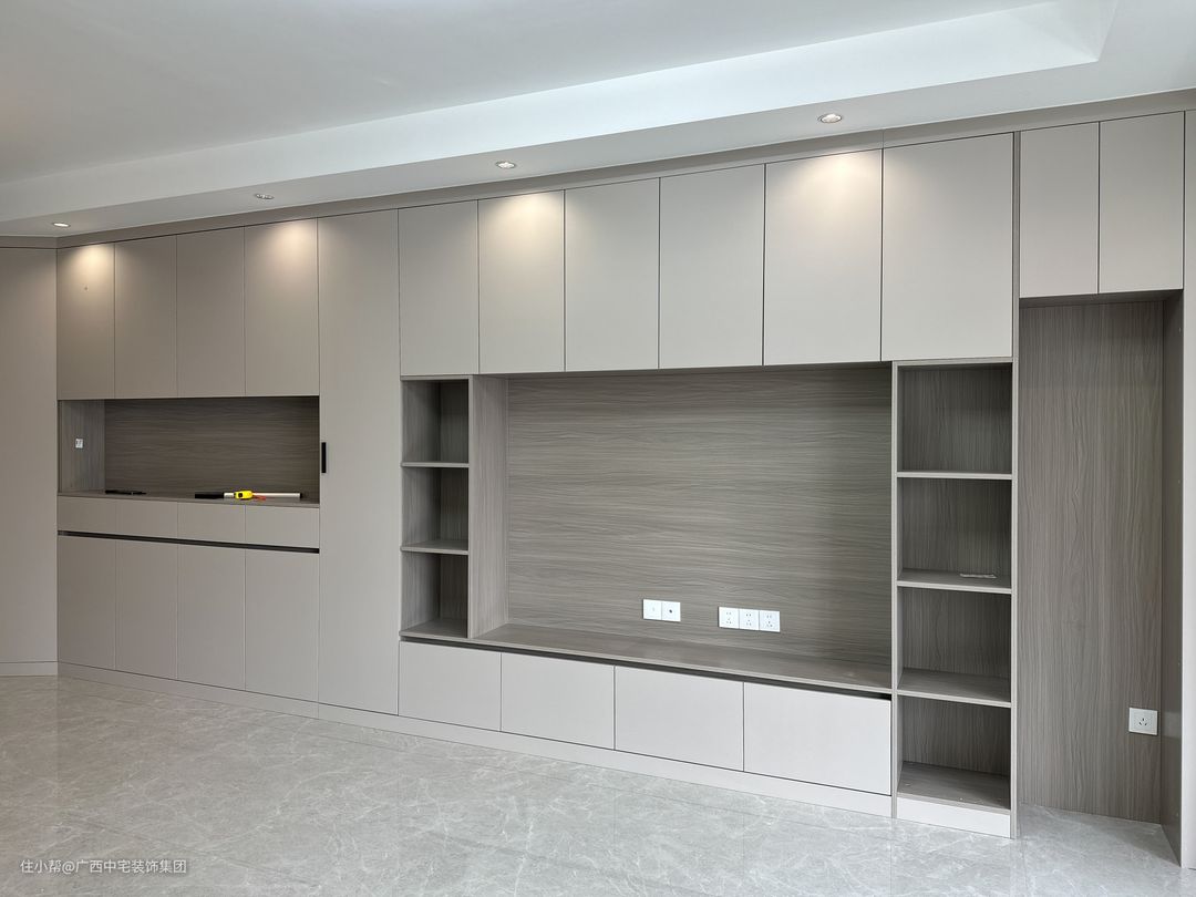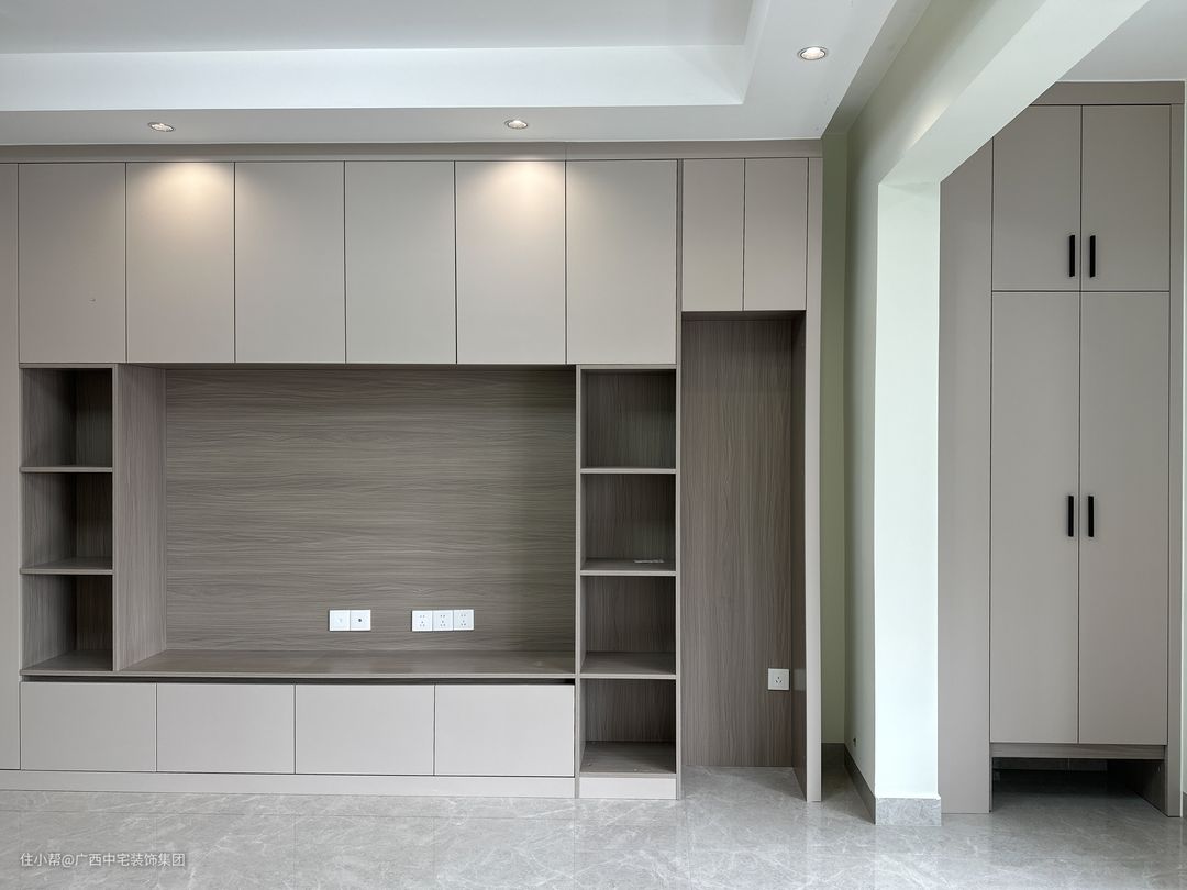 客厅以灰色来勾勒轮廓,原木来烘托氛围,恬静自然的氛围晕染开来。电视柜嵌入电视和储存物品,实用性和观影性很高。灯光秀以主灯+射灯,温暖空间。后期配上舒适沙发,一家人围坐在一起畅聊趣事、观影,齐聚一堂,其乐融融,幸福无比。