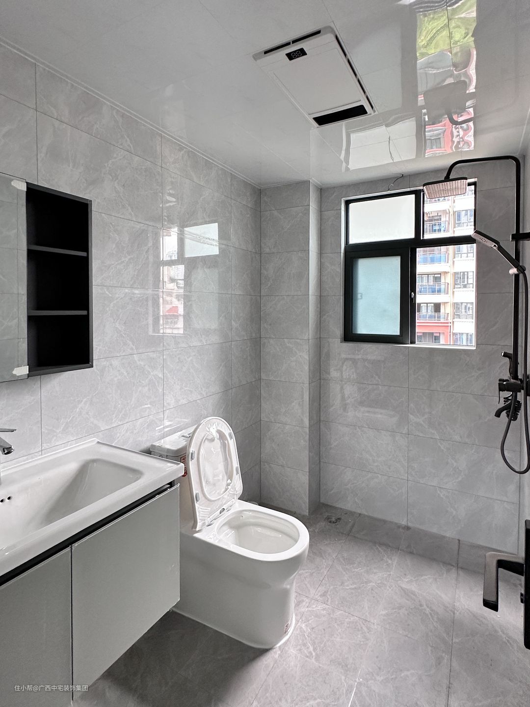 卫生间是集洗漱区、沐浴区、如厕区为一体的空间。陶柜一体化洗漱台前置物架,好收纳护肤品、洗漱用品,一目了然。智能马桶缓解了就蹲脚麻的尴尬局面。一个黑色洒花,一场缓解疲劳的沐浴。