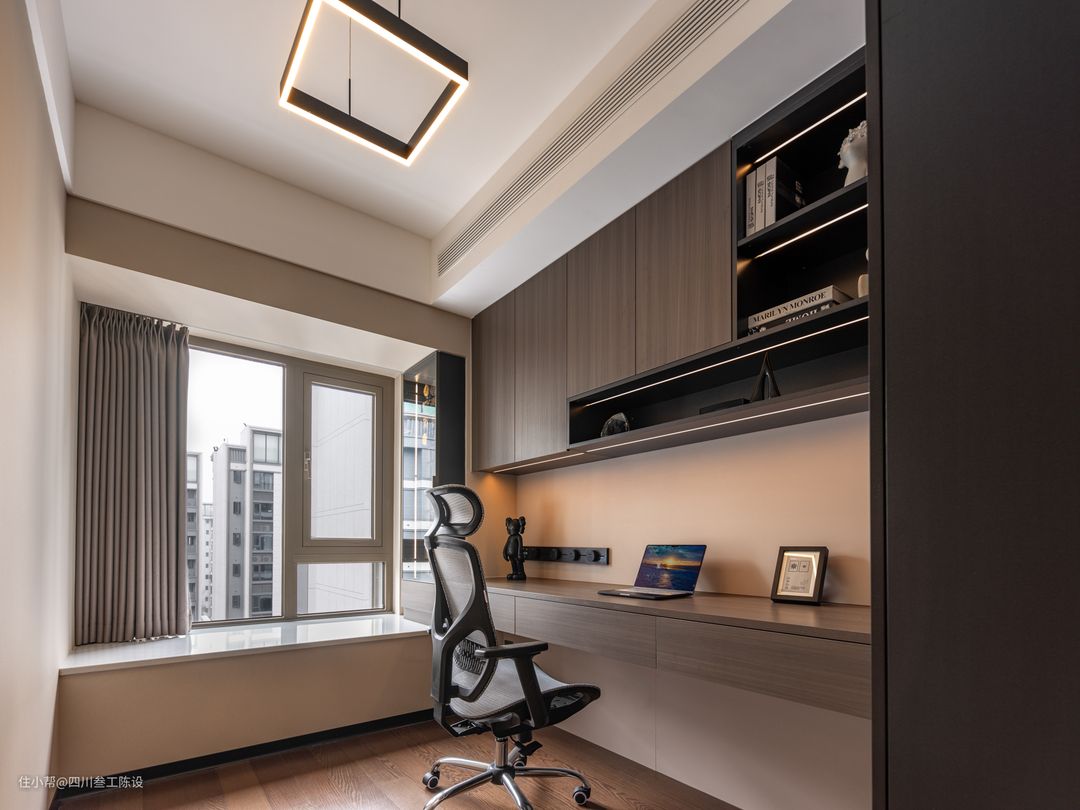 书房的设计整体风格偏向于意式,在简约的设计中也掩盖不了内在的高级感,平面吊顶隐藏中央空调,中间的LED灯暖黄色的灯光与金属边框,渲染高端格调。 房间自带的飘窗不能打,于是上面做半窗帘,不影响空间采光与视野,侧面做定制柜,增加空间收纳,透明柜门可以很轻松看到一些户主收藏的徽章。