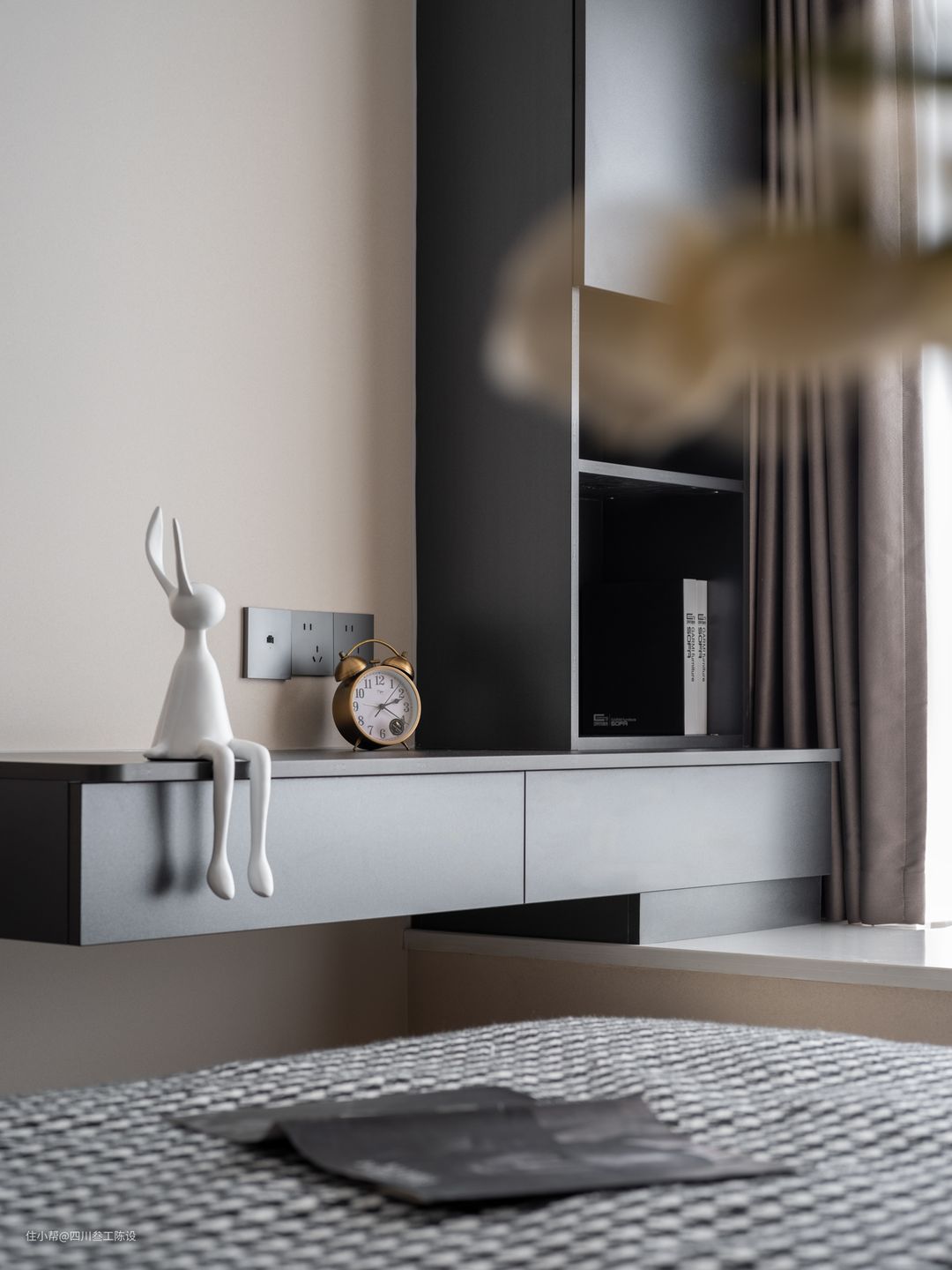 飘窗能够引入充足的自然采光,因此考虑到采光问题,设计师将飘窗上的空间利用了起来,上面安装开放格方便放置物品,下面的柜子做了延伸。 高矮正好代替了床头柜,大气简约还美观,底部留空方便清洁卫生无死角,搭配的毛绒凳柔软舒适,自带弧度,久坐也不会不舒服。