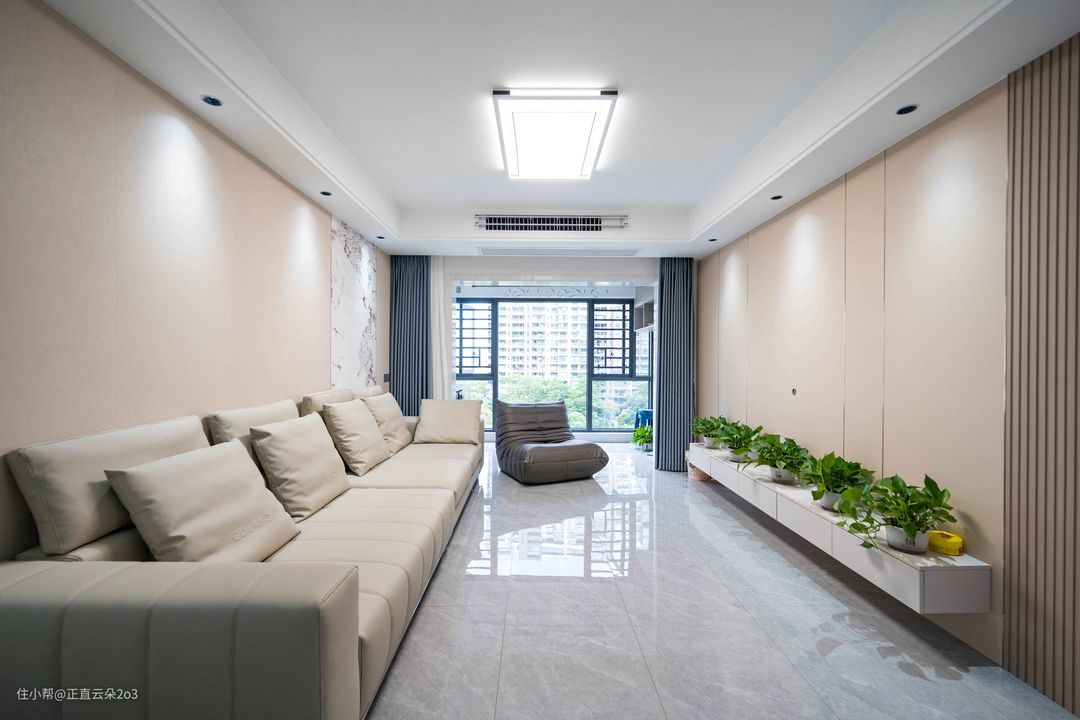 装修需求: 1、客厅面积大合理利用一下 2、自然与现代元素的结合:将自然元素与现代设计融合,创造一个和谐统一的装修风格。运用自然材料、绿色植物和自然光线,营造温馨自然的氛围,同时融入现代设计元素,展现时尚与舒适的结合。 3、自然与现代元素的结合 设计亮点: 1、客厅分成了阳台跟客厅,阳台上放着洗衣机 2、空间流畅和通透感:注重空间布局,确保不同区域之间的流动性和通透感。采用开放式设计,合理分隔私密区域和公共区域,以实现空间的灵活性和连续性。 3、将自然元素与现代设计融合,创造一个和谐统一的装修风格。运用自然材料、绿色植物和自然光线,营造温馨自然的氛围,同时融入现代设计元素,展现时尚与舒适的结合。 方案解析:本期案例充分利用每个角落的储存需求,保持房间整洁不拥挤。光线引导设计利用半透明隔断和明亮的墙壁色彩将自然光线引导到更深的室内空间,增加室内的明亮度。同时,融入自然元素如木质地板、天然色调的家具和绿植等,营造舒适、自然的氛围。整体方案简约实用,打造一个清新、舒适的居住环境。