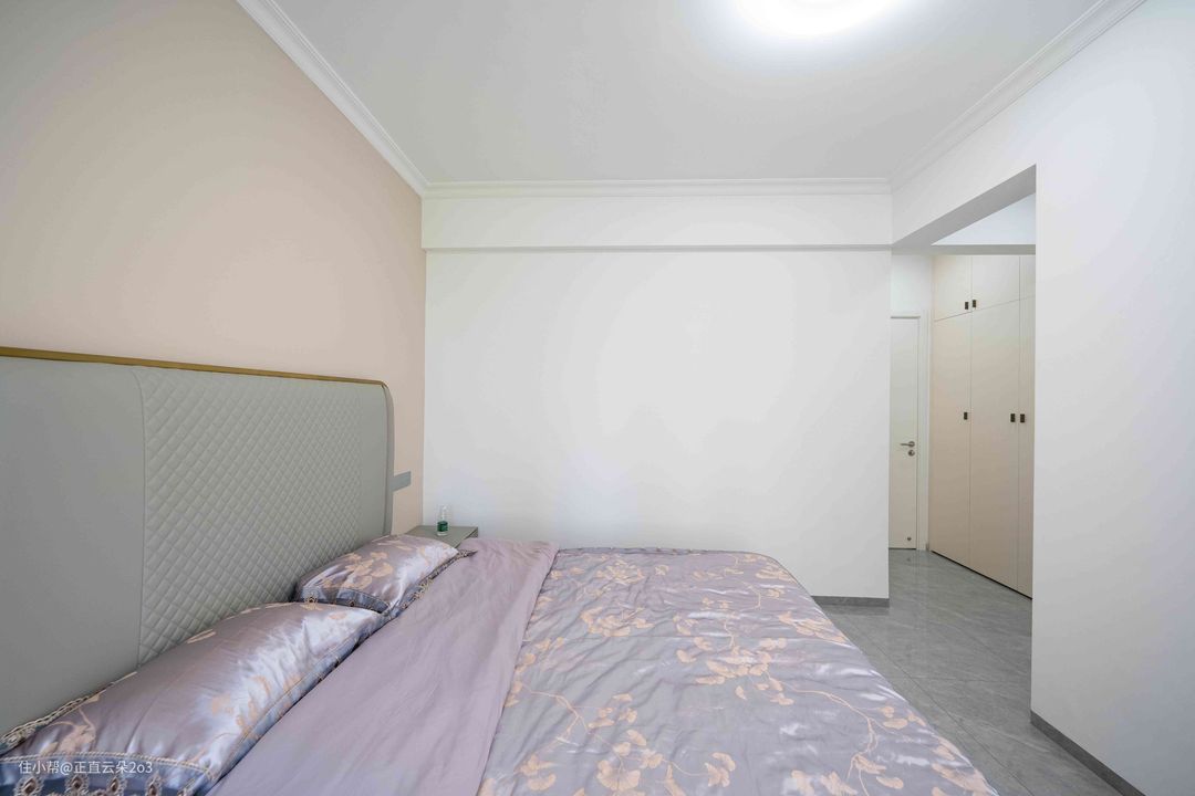 卧室入门有一条狭长的走廊。在走廊的墙壁上巧妙嵌入到顶衣柜,形成一个简洁精致的一字型衣帽间。衣帽间将被柔和的筒灯照亮,为房间带来明亮的照明。 主卧背景板则采用了咖色壁纸,明亮的灯光与之相得益彰。粉紫色床品的搭配蕾丝花边的点缀,床是真皮质的,有着金边嵌入,高级大气,增加视觉层次感。床侧的斗柜恰到好处地增加了储物空间。飘窗铺设了软垫,打造出一个温馨的小憩角落。 床侧的斗柜恰到好处地增加了储物空间。飘窗铺的设计,打造出一个温馨的小憩角落。