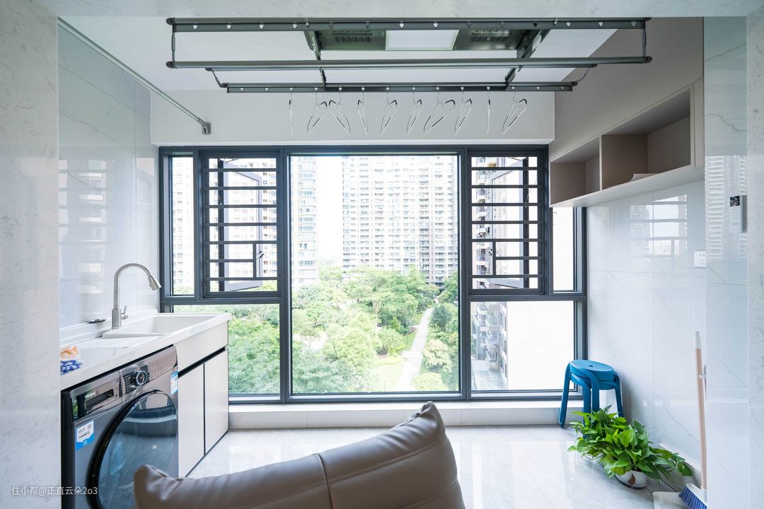 客厅采用灰色的简约风格,创造出一个现代而舒适的空间。墙面选择米白色,营造出宁静和平衡的氛围。搭配简约的家具,如灰色皮艺沙发、白色电视柜等,以保持整体风格的统一性。中性色调既能提供稳定和平静的感觉,又能为空间增添一份优雅和现代感。 在灯光方面,选择柔和而充足的照明,如筒灯或吊灯,以营造温馨的氛围。同时,可以在客厅中增添一些装饰品,如抱枕、植物等,以增加层次感和自然元素。整体上,中色系色简约风格的客厅创造出一个舒适、时尚且宜人的休息和娱乐空间。 另外靠近窗户的地方设计成了一个阳台放了自动洗衣机、洗手台、收纳柜。还有一个自动升降的衣架。更好的方便晾晒衣物。