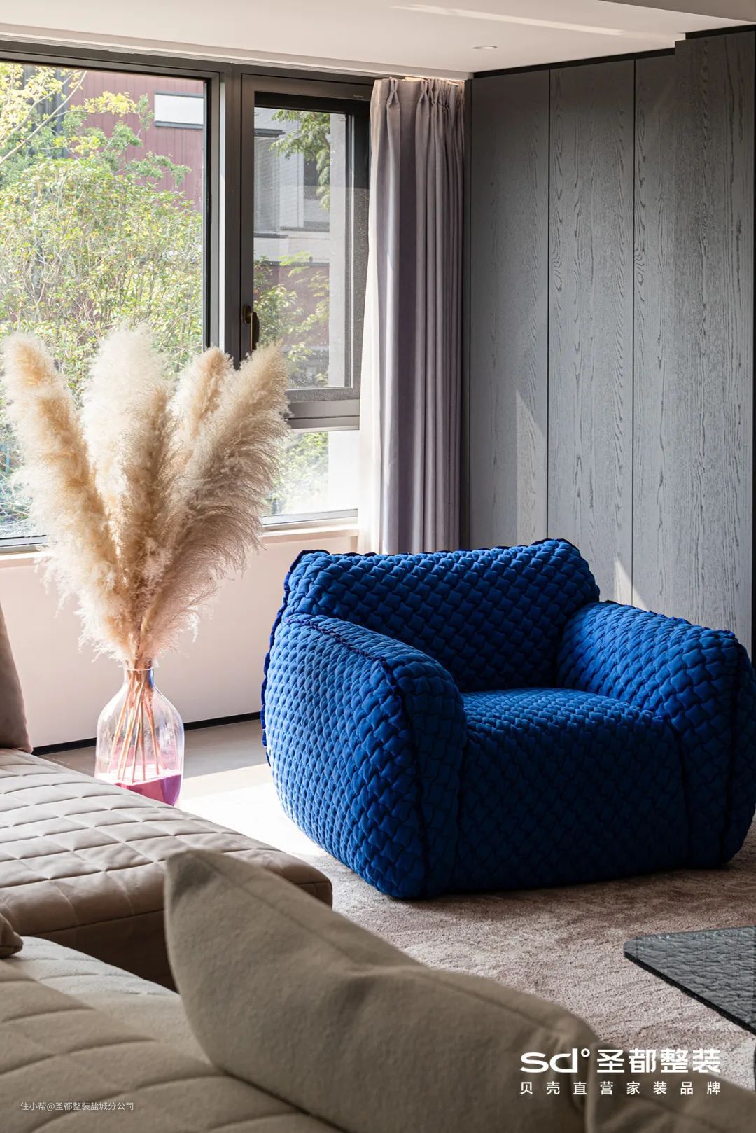 越来越多的朋友都对大横厅情有独钟,本案的户主也不例外。在征得夫妻俩的同意后,设计师果断放弃与客厅毗邻的南次卧,将其与阳台一同纳入客厅体系,形成了夫妻俩怦然心动的大横厅。 “大面积的落地窗+开放式布局”让客厅的采光好到令人流连忘返;围合式布局不仅方便亲友闲坐时交流互动,还能传递出客厅的包裹感和包容情绪,进一步提升空间的温度与温情。 以沙发靠背为分界点,后方辟出一方空间规划成茶室,并安置了一架书墙,这样一来,无论是一人品饮独得神韵,还是多人论茶得趣又得味,都是“赌书消得泼茶香”的最佳写照。