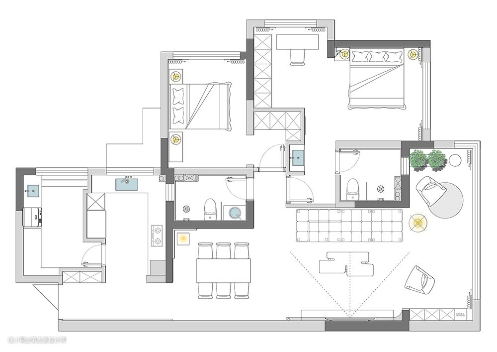 设计师在色彩、软装、灯光的搭配上都有着设计的巧思,色彩上摒弃了亮色的硬装,整个空间更加耐看也方便后续的调整,同时使用了一些绿植、毛毛虫沙发以及小推车等,用局部色彩进行点缀,增加整个空间的丰富度。灯光上根据空间色调进行灵活调整,营造出温馨治愈的空间氛围。 · 【户型改造】 ①客厅阳台打通,并优化大阳台的原始功能,使其收纳更整洁、休闲更舒适; ②借助小房间延伸厨房面积,并做家政间使用,满足洗衣晾晒以及杂物/清洁工具等收纳; ③房子是业主给父母的养老,实用兼好打理为主,而且空间中也有很多符合父母习惯的小物件。
