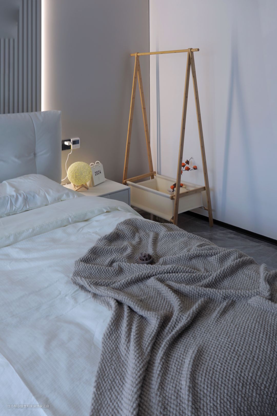 三面开窗,自然光线充足,浅灰色的窗帘遮光度十足,明暗变化,自由随心。飘窗上铺设毛毯,增加居住舒适度。