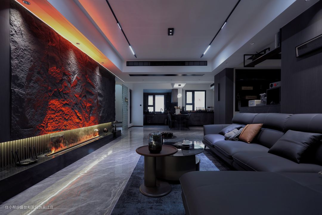1.整个横厅用灰色大理石通铺,链接空间之间的关系,形成各个区域视觉效果的统一。 2.客厅没有放置电视,隐藏式投影幕布嵌入其中。嵌入式筒灯增加光影层次,暖光色调灯光的加入打破冷硬氛围,柔和空间气质。