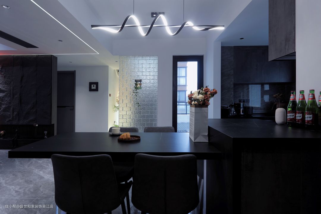 1.餐厅与厨房、酒柜之间保持了开阔的动区,用餐桌上方吊灯在视觉上进行空间划分,整个空间自然流畅。 2.沿边线定制餐边柜,节省空间,保持开阔空间。柜体纯黑,无把手配件,质感统一。