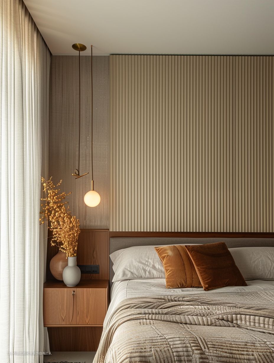 次卧采用木质床头柜,增加了次卧的储物空间。床头白色吊灯和床头花瓶的搭配,让次卧更加时尚。