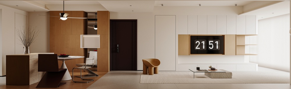 ■起居室我们选择了多人沙发与单人沙发对坐的形式,整体空间使用米色涂料,使得空间整洁清爽,局部的沙发跳色与墙体质感形成对比,增强了空间材质的丰富度,整体空间随性且不刻意。