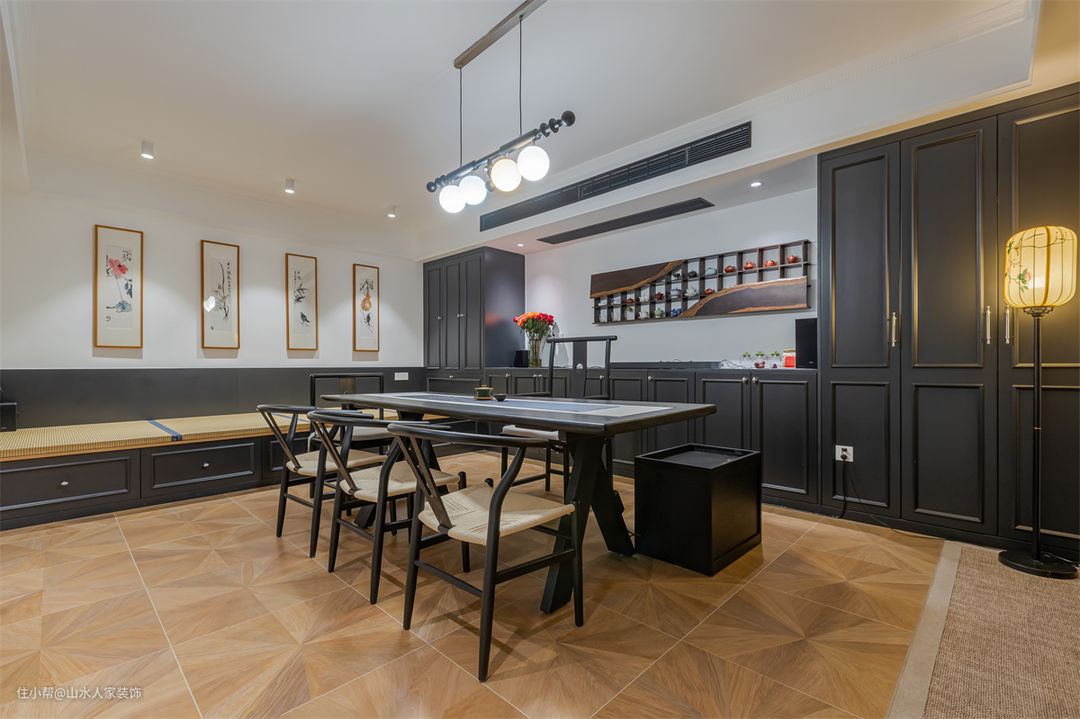 客餐厅整体做了贯通,空间格局变得开敞又通透,结合顶部蚕丝吊灯,彰显更多美感。一侧墙面搭配了花卉挂画和黑色过道柜,凸显色调的反差感,黑白色交织勾勒出气质空间。 另一侧墙面则打造了整体组合柜,以黑色为基调,视觉上精致大气。内部储物量较多,模压板柜门层次显著,赋予空间更多节奏和轻奢感。