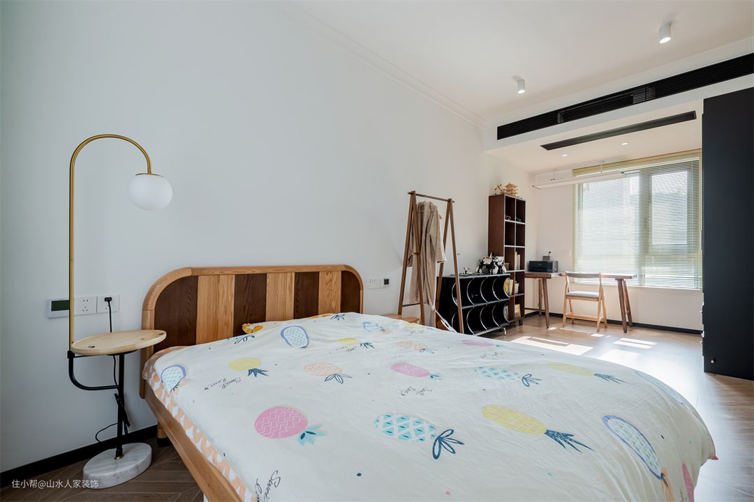 除此之外,床具同样用到鲜亮的橙色系,完美适配整体空间,造型呈现也特别精致。墙面满刷乳胶漆,大量的留白处理给人一种干净大气的感觉。铺上了鱼骨拼木地板,不仅脚感舒适,整体看上去也温馨感十足。
