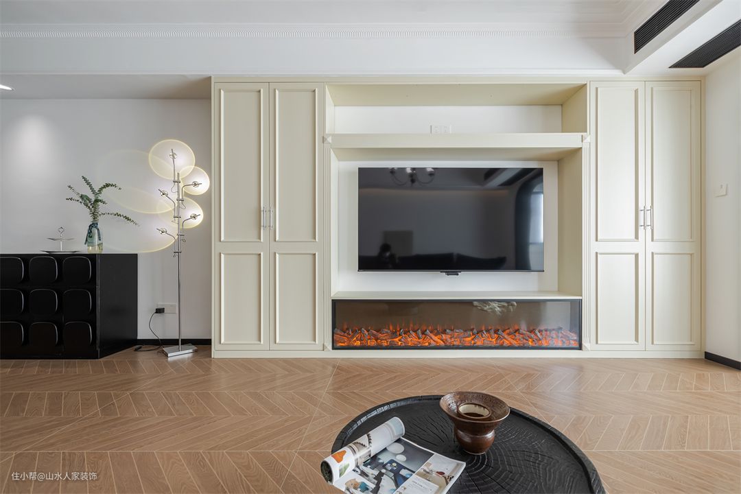 客厅大面积留白,给人留下了纯粹干净的印象。结合白色吊顶+石膏造型,复古大吊灯成为最瞩目的存在。地面通铺鱼骨拼的实木地板,提升不少空间档次。 电视背景墙选用奶油色墙板,凸显其高度和宽度,使得整个空间愈加明亮。整体做成电视柜的样式,相应增加储物。原地台位置设计成3D壁炉效果,火焰不断升腾,灵魂愈加炙热。