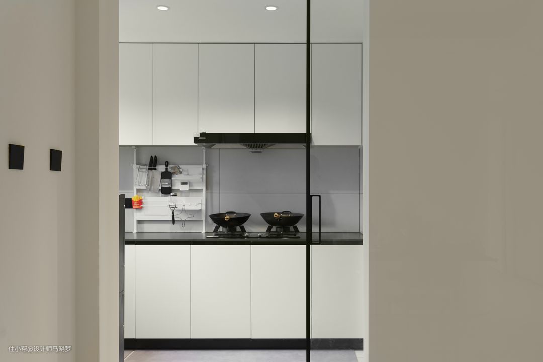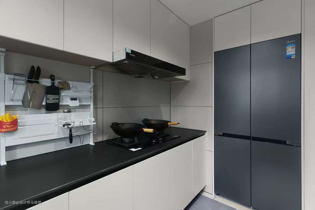 厨房的台面采用的深色的板材,提升了整体厨房的质感。厨房采用暗藏式单推门设计,不仅让进出厨房的过道显得更宽敞,同时也同时满足了开放与封闭厨房的要求,打破了传统的封闭式设计,使空间更加的通透和自由,增加了家人之间的互动与沟通