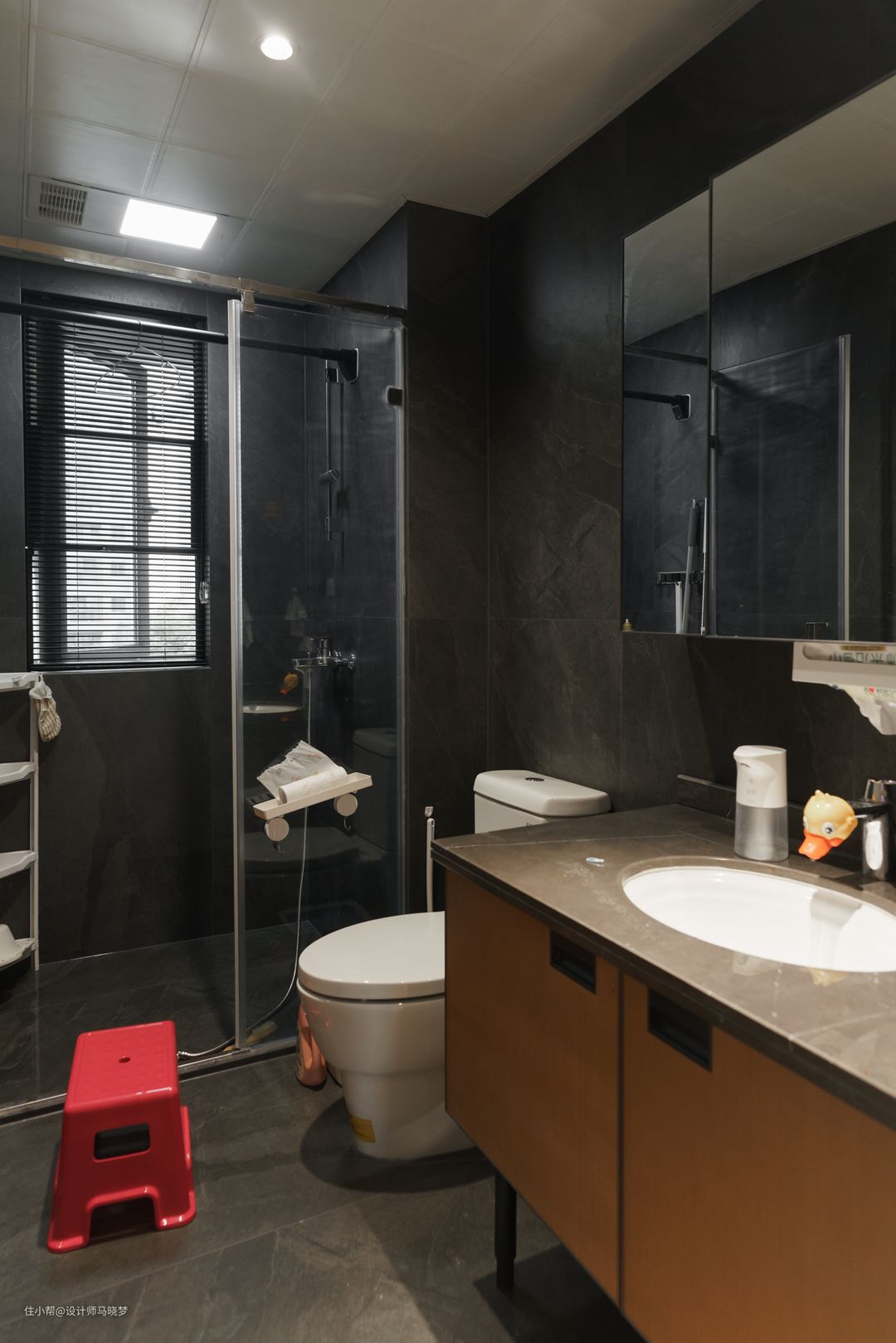 ✨卫生间墙地砖进行了更换,采用暗黑系的装饰,空间更显高级感