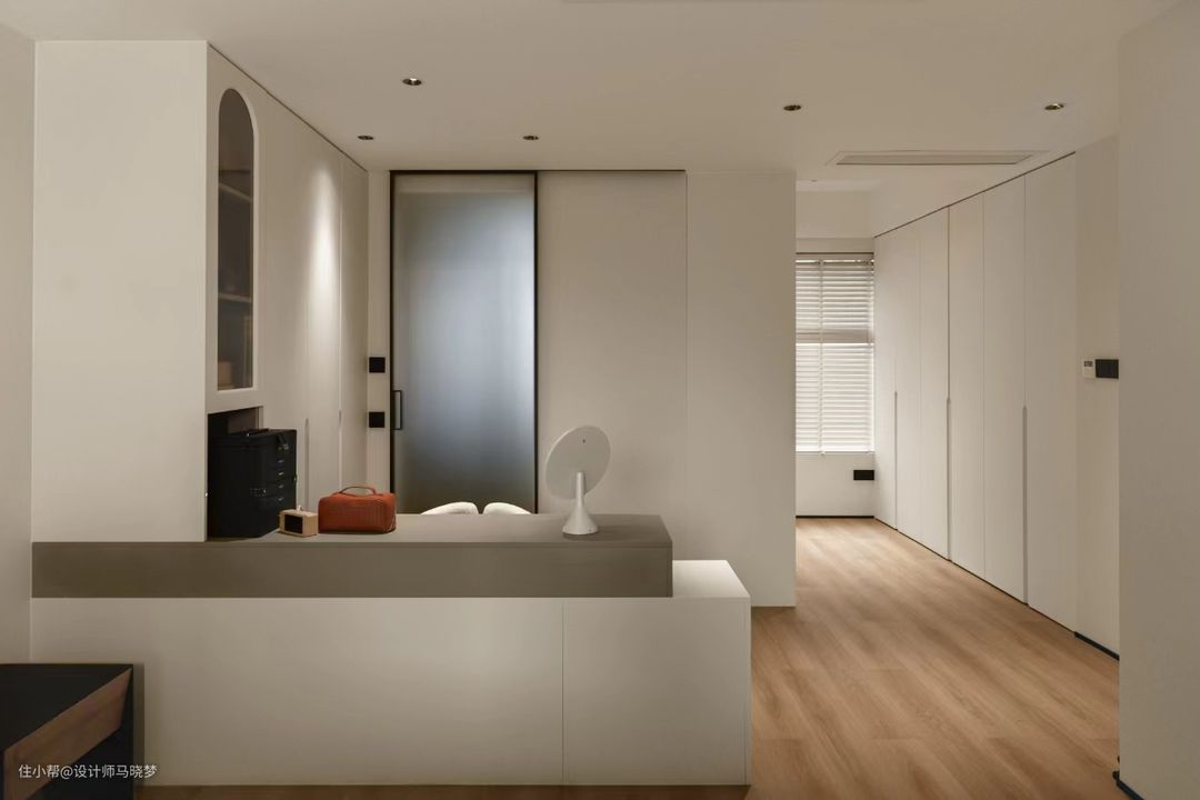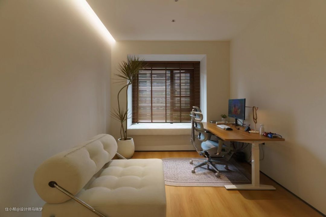 ✨打破原有客厅的传统布局,不设置电视背景墙,电视采用移动的支架,给空间带来更多的可能性 ✨将进门的卧室与客厅相连接,打造城一个半开放式书房,可以休闲,可以工作等 ✨主卧与衣帽间相连接,增加主卧的收纳,便于主卧的更好利用