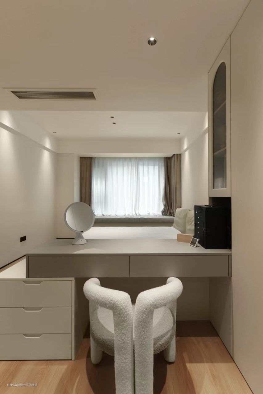 ✨足够空间的收纳让空间显得更简洁 ✨没有做单独的隔断,来隔开卫生间与主卧室,采用开放式的设计手法,把卫生间门当成正面墙的装饰,增加空间的通透感 ✨梳妆台采用层次化的设计,给简洁的空间带去部分层次