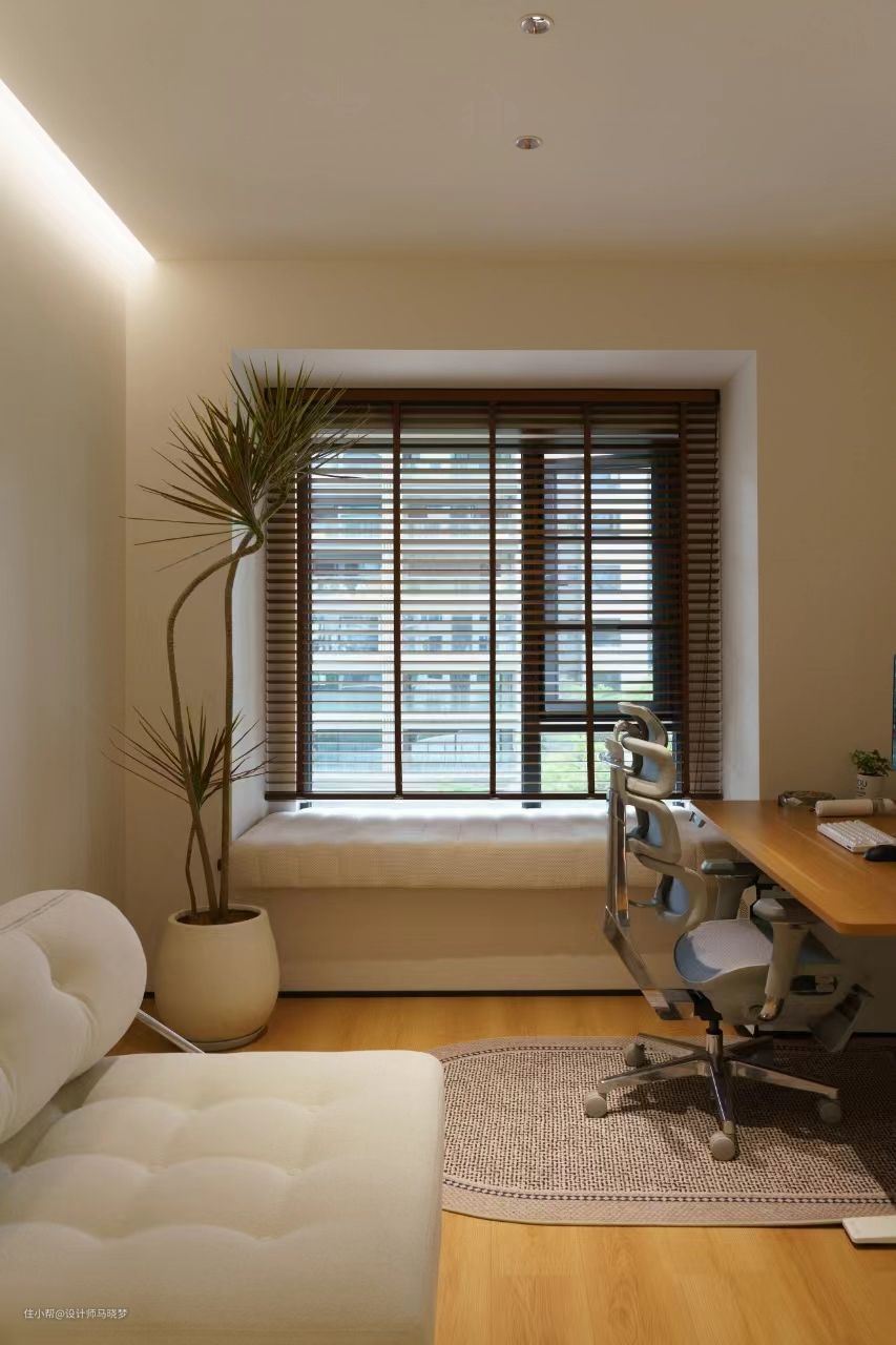 木质百叶、原木色地板让人身处在这个空间会显得更加的放松