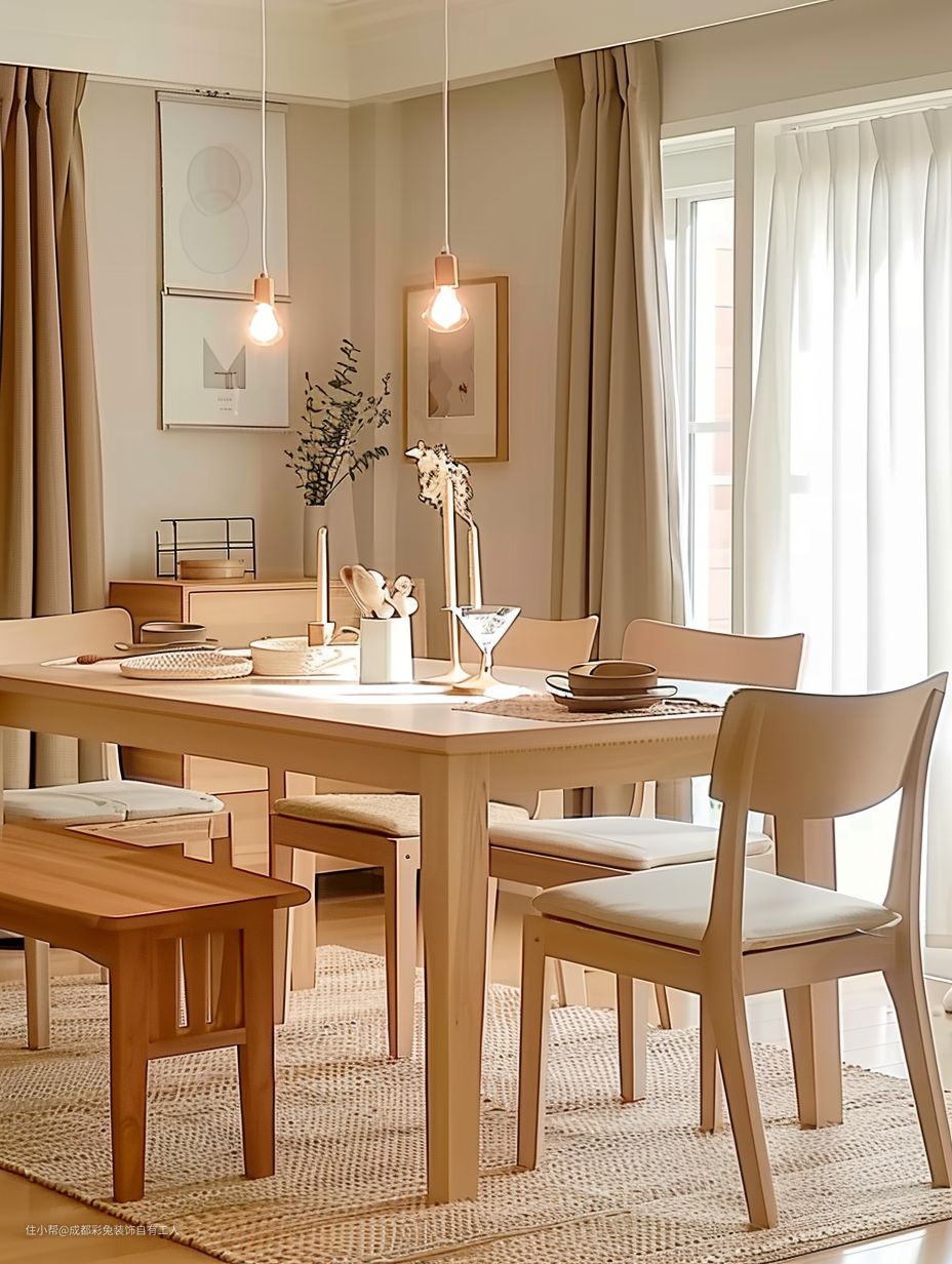 餐厅与客厅相连,形成了一个通透的空间,让整个家看起来更加宽敞明亮💡。原木色的餐桌椅与奶油色的空间相得益彰,给人一种温暖、自然的感觉🌞。靠墙放置的餐边柜不仅增加了储物空间,还提升了餐厅的实用性👍。