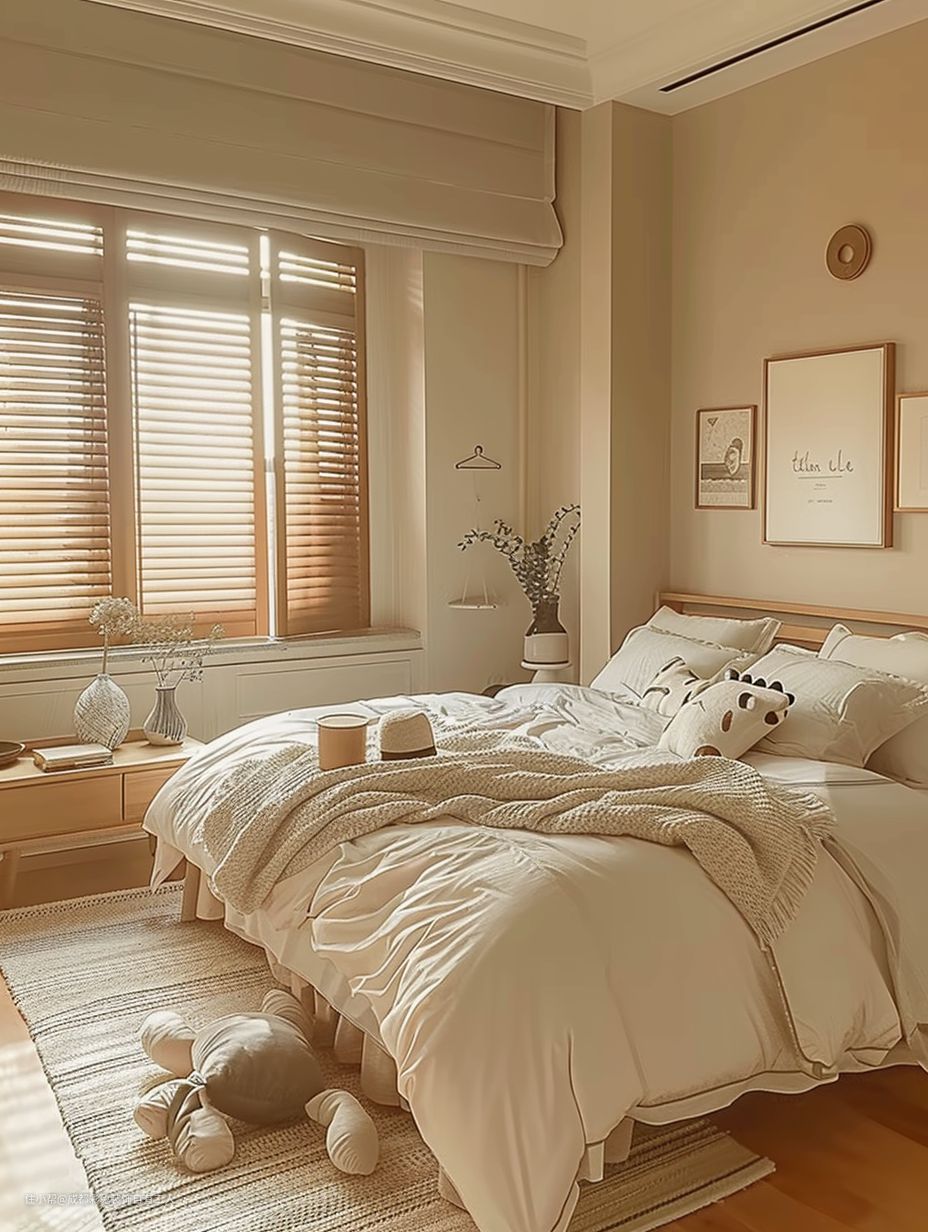 卧室延续了奶油色的主调,营造出温馨、舒适的睡眠环境😴。原木色的家具和装饰品为卧室增添了一份复古的气息🎞️。床头的壁灯和装饰画为卧室增添了一份艺术感🎨。