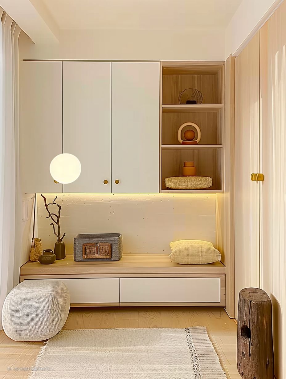 一进入家门,就能看到那精致的奶油色天地柜🥰,它不仅提供了充足的收纳空间,中部的留空设计还方便我们日常放置物品,搭配上舒适的换鞋凳,简直太贴心啦😘!再加上浅色的地面,让整个玄关看起来更加明亮宽敞,给人一种温馨又舒适的感觉💓。