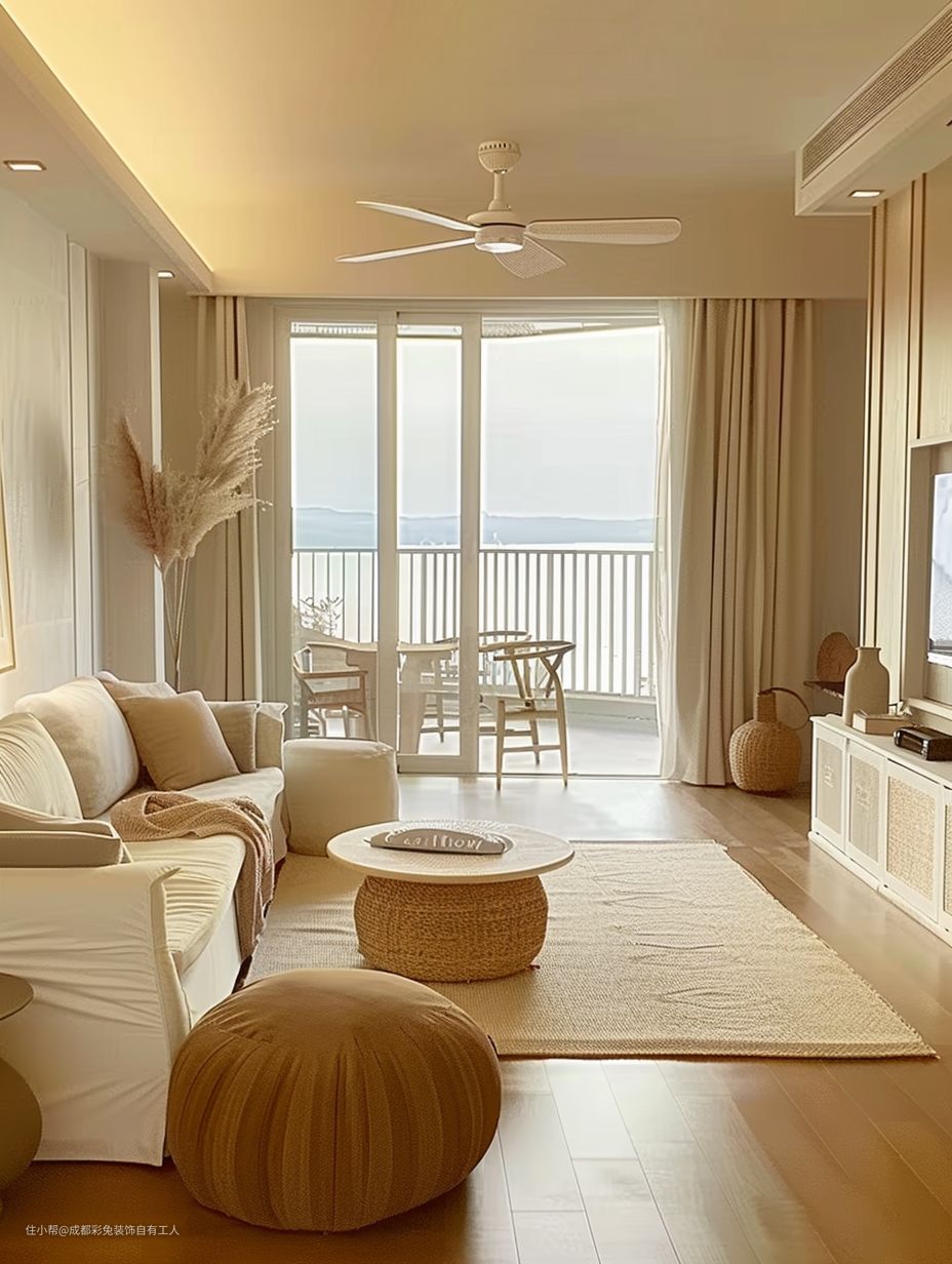 选择了一套浅色系的沙发🛋️,搭配着毛茸茸的抱枕,给人一种舒适又温馨的感觉😘。窗帘则选用了与整体风格相匹配的款式,让客厅更加和谐统一🎊。