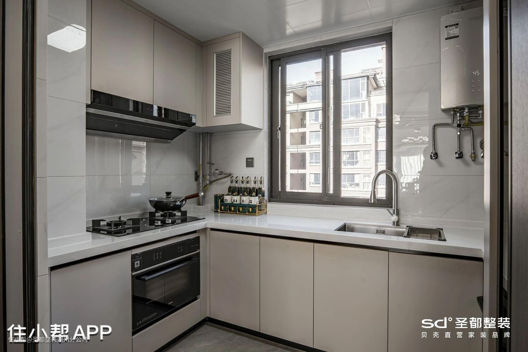 原户型中,厨房面积偏小,设计师以浅色系打底,搭配玻璃推拉门,在视觉上起到放大空间的作用,不显压抑和逼仄;U型橱柜+嵌入式家电,让小厨房也能拥有超强的收纳力。