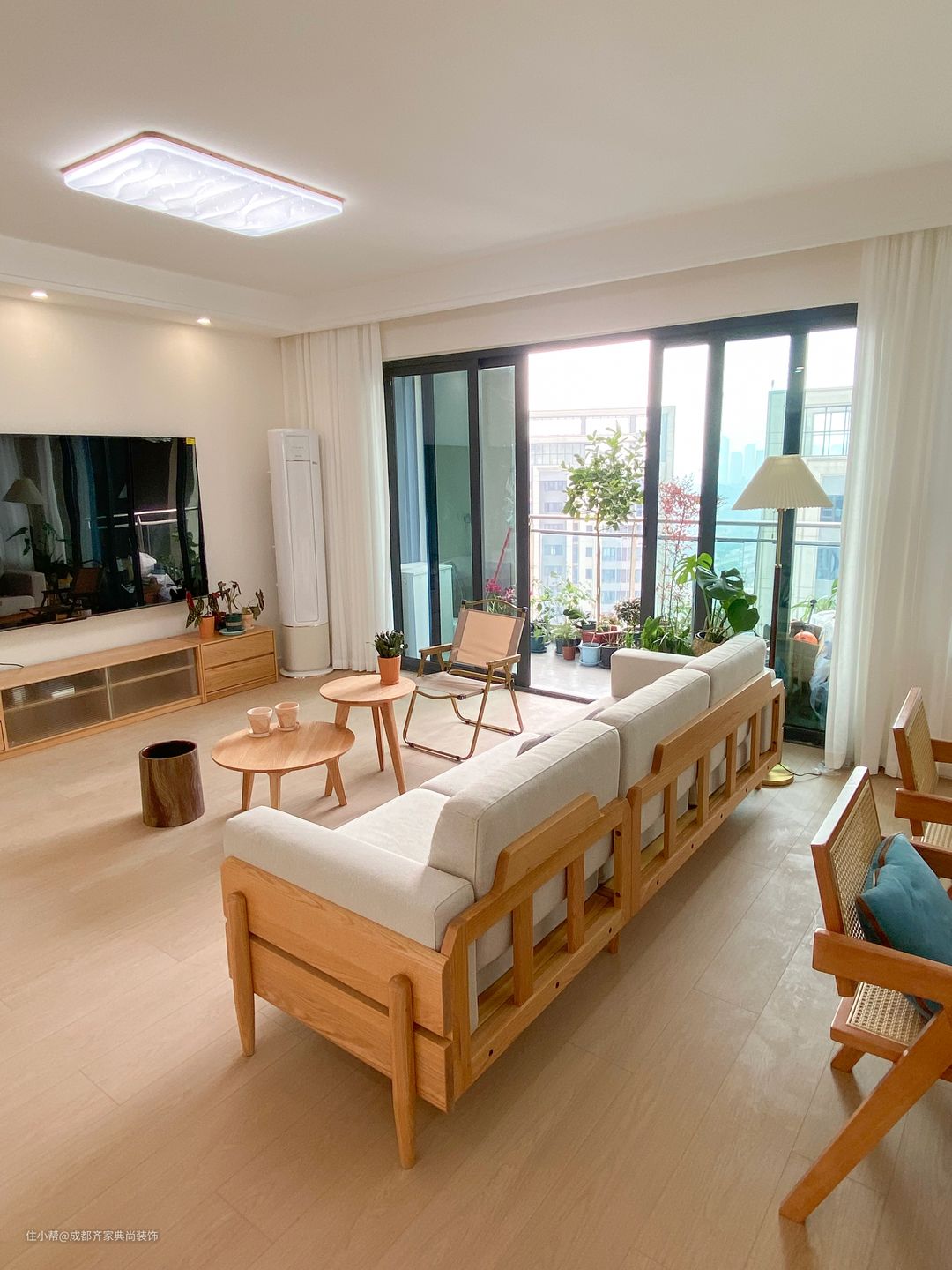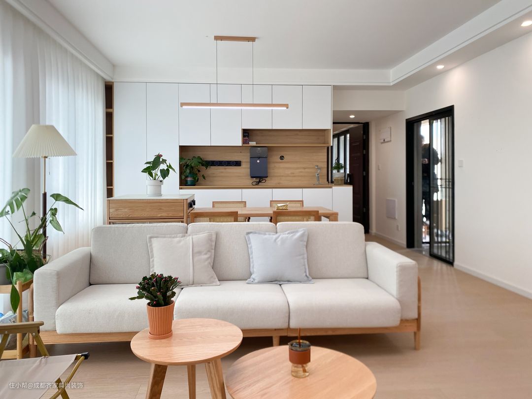 因为客厅是横厅设计,所以可利用性很高。 整体木地板通铺,让空间更有一致性。在搭配原木的沙发茶几和电视柜,整个空间又通透又干净。 白色布艺的沙发让客厅显得更加的柔和舒适,角落和茶几的绿植的点缀让空间更加生动有趣。