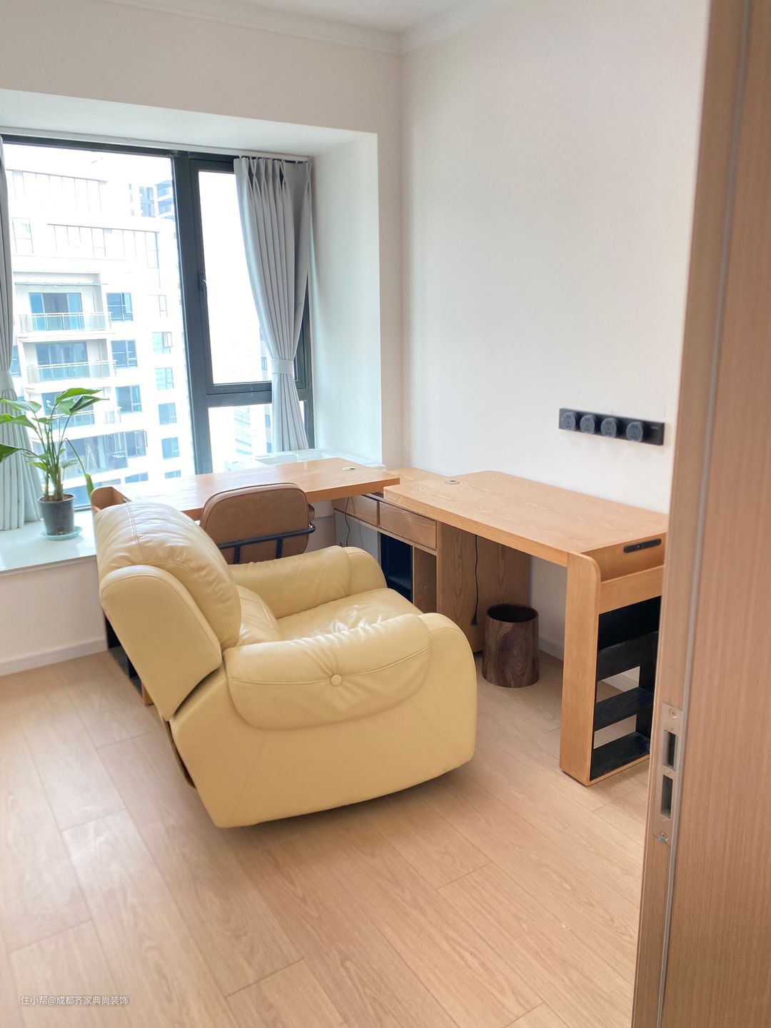 将其中一间次卧设计成书房,同样搭配了原木色的书桌。 独立按摩椅的设置,让人在学习工作的期间也能得到很好的放松。