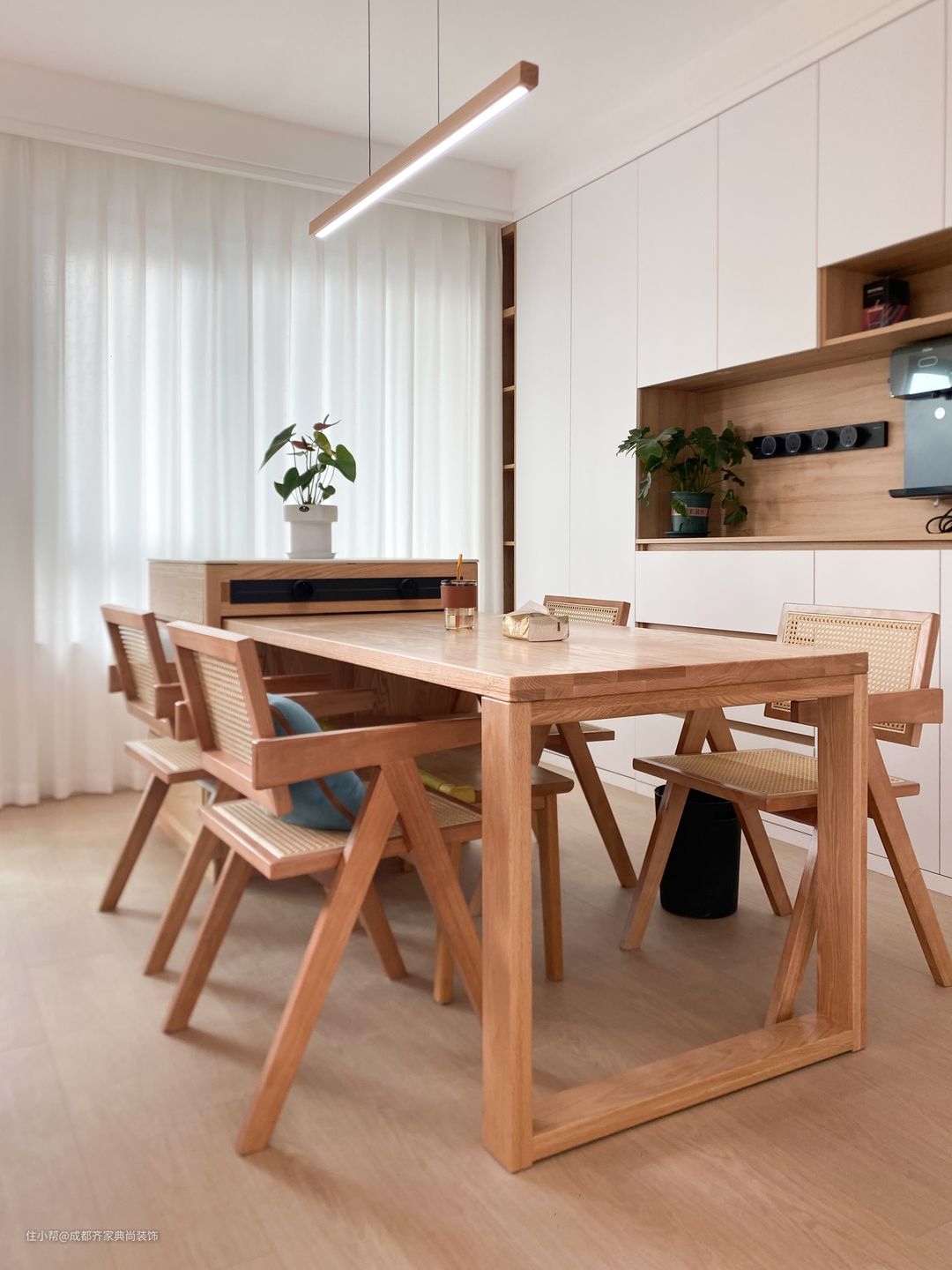 餐厅设计在客厅沙发背后,整体是客餐厅一体的设计,让一进门的这个大空间显得更加的通透。 为了整体的风格统一,所以也搭配的是原木的餐桌椅。再搭配了原木色的岛台设计,增加了餐厅的实用性,让用餐也能成为一种乐趣和兴致。 靠墙设计了整排到顶的餐边柜,这样就大大增加了这个区域的储物收纳面积,可以将一些常用的小家电放置在台面上,这样又方便又不会显得杂乱。