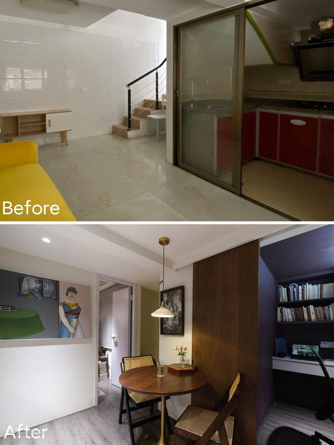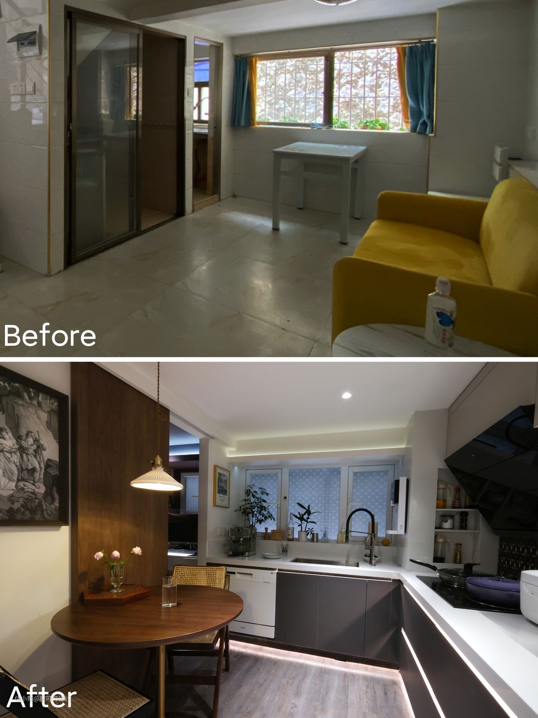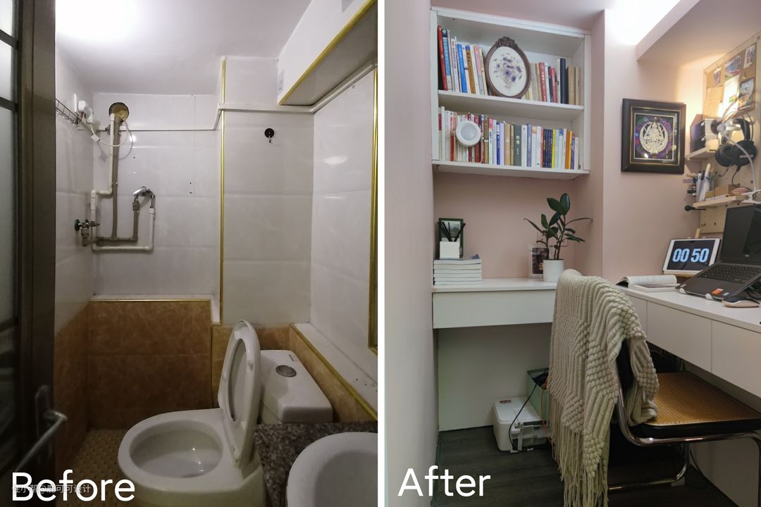 设计前后 △改造前原本是二楼的卧室,改造后成了一个独立的,宽敞的客厅。 △改造前一楼原本是家里客餐厨区域,改造后成了餐厨一体,多了一个卧室,一个书房,洗手间做了干湿分离。 △原本的洗手间非常小,现在改成了一个独立的小书房。 △餐厅厨房在改造后不缩小面积的情况下还增加了收纳空间。