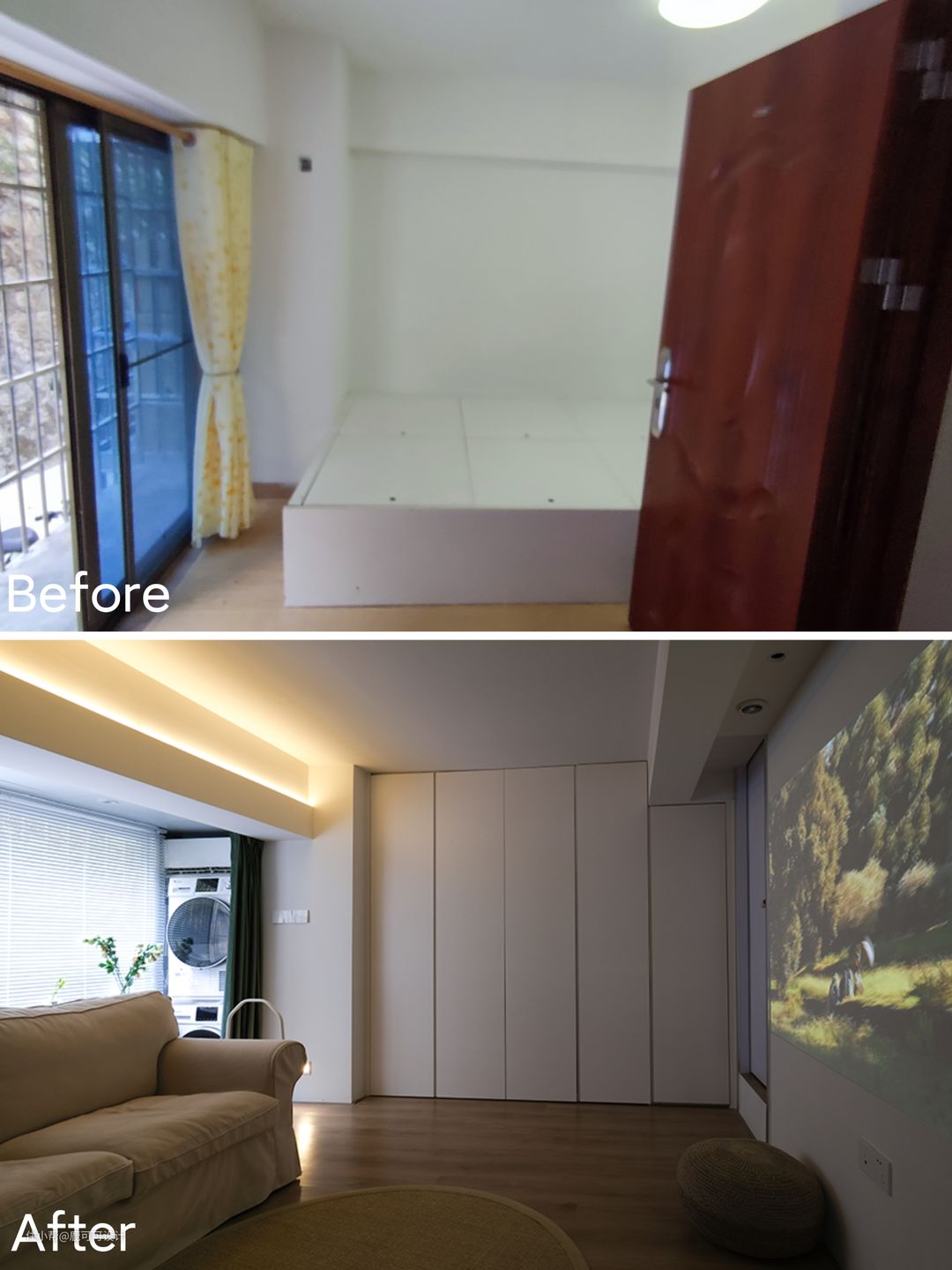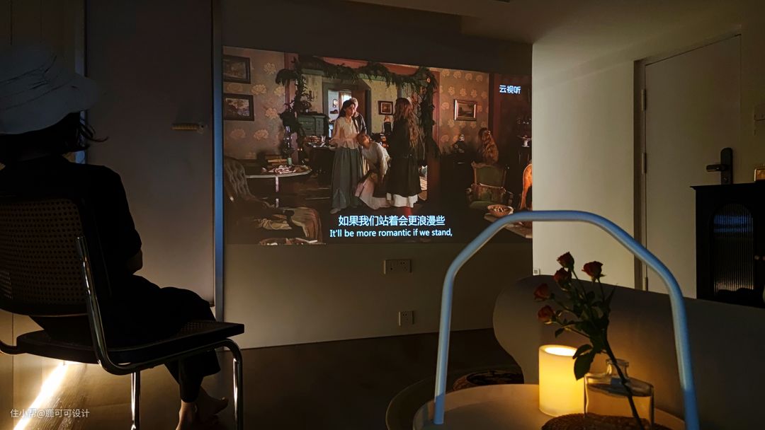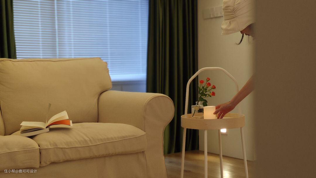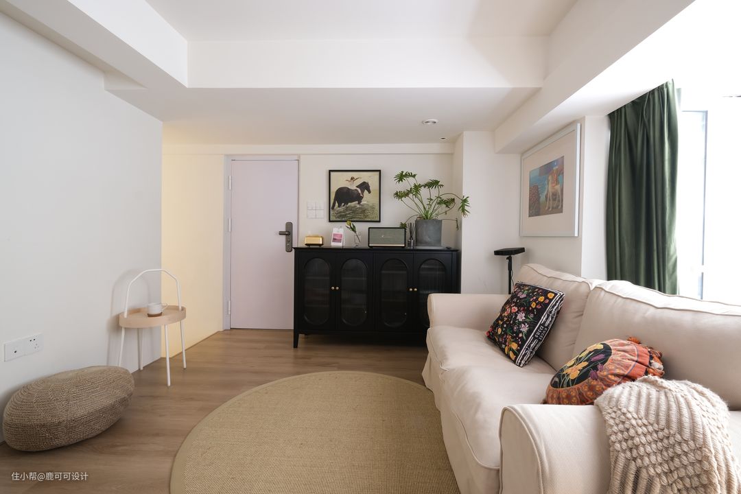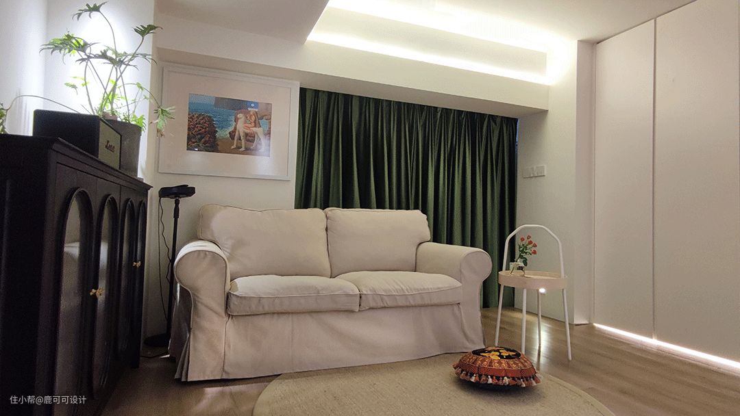 △说到了客餐厨这三个空间,一般的布局都会把它们放在一个位置,跳出这个思维,逆向垂直,分成两个空间,客厅单独设计在二楼,改造后的客厅是在房子的二楼,相对独立,安静,整个客厅是一个4100×4200的空间,墙面用暖色大白色调,与地面木质元素的融合,增加自然与温暖的空间氛围。 #客厅 #装修设计 △沙发后面用了两种材质的窗帘,一层是白色百叶,一层是绿丝绒的布帘。 绒布窗帘的密度比较高,白天看投影的时候拉上就跟夜晚时的效果一样,清晰。#客厅 #投影 △沙发背后是有800mm宽的墙面,是一个不完整的背景,用墨绿色的丝绒质地布帘运用对称的设计手法,使整个背景更加的完整,给轻颜的空间增加了精致的仪式感,稳重感。 #客厅 △这面墙特地留白,看电影直接投到墙面,屋主说这面墙的使用率蛮高。 朋友过来一起看影片,玩游戏,像影式飞镖,投篮等都不错。 平时还可以投影跟跳健身操,关掉投影后就是一片空白的白墙,整个客厅的空间在沙发上坐着特别的放松。 △甜酷的黑色柜子是客厅比较重色的点缀家具,1500mm的长度,400mm的宽度,也是一个客厅补充收纳的地方,椭圆形的柜门内嵌长虹玻璃,搭配复古金色把手,黑色,也可以很浪漫。 #客厅 #装修设计 △屋主姐妹家的小帅哥过来过生日~大面积的奶油白柜子也是一个很好布置主题的背景。 △二楼的入口,设计优化后的楼梯没有之前的弯弯绕绕,可以直接走到二楼,具体的可以看最尾的对比图。
