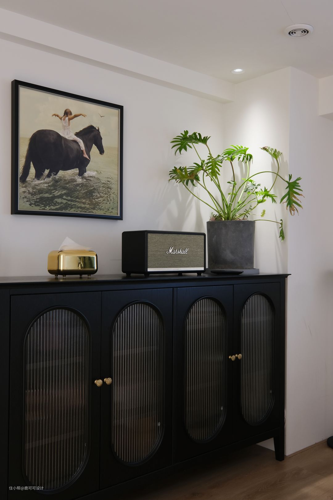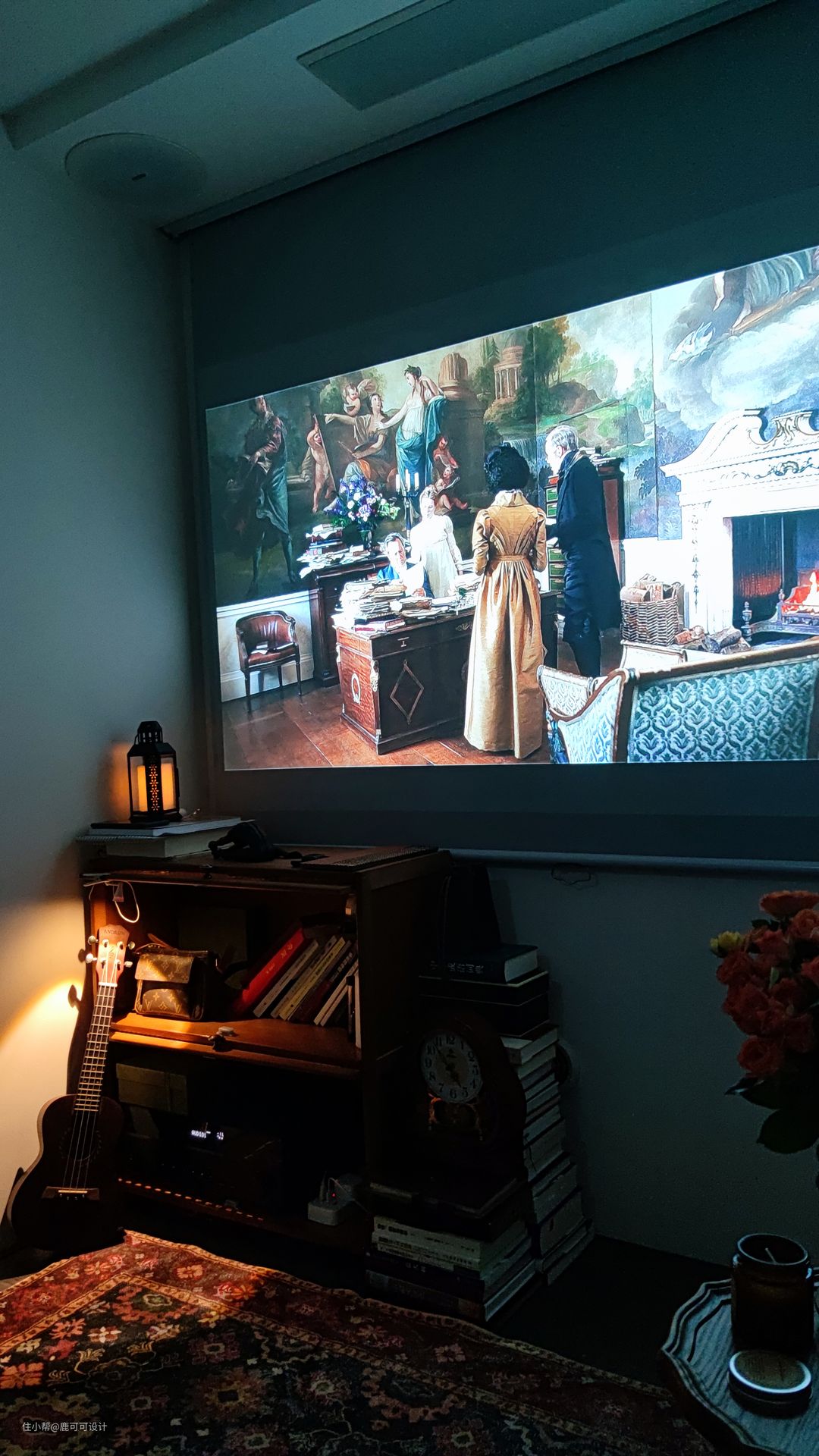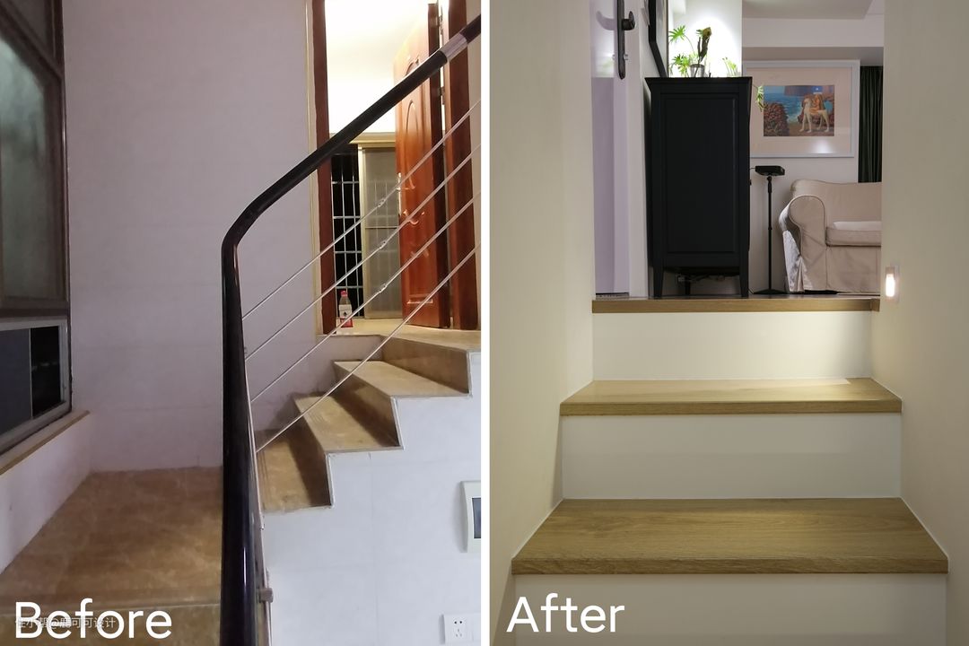 △说到了客餐厨这三个空间,一般的布局都会把它们放在一个位置,跳出这个思维,逆向垂直,分成两个空间,客厅单独设计在二楼,改造后的客厅是在房子的二楼,相对独立,安静,整个客厅是一个4100×4200的空间,墙面用暖色大白色调,与地面木质元素的融合,增加自然与温暖的空间氛围。 #客厅 #装修设计 △沙发后面用了两种材质的窗帘,一层是白色百叶,一层是绿丝绒的布帘。 绒布窗帘的密度比较高,白天看投影的时候拉上就跟夜晚时的效果一样,清晰。#客厅 #投影 △沙发背后是有800mm宽的墙面,是一个不完整的背景,用墨绿色的丝绒质地布帘运用对称的设计手法,使整个背景更加的完整,给轻颜的空间增加了精致的仪式感,稳重感。 #客厅 △这面墙特地留白,看电影直接投到墙面,屋主说这面墙的使用率蛮高。 朋友过来一起看影片,玩游戏,像影式飞镖,投篮等都不错。 平时还可以投影跟跳健身操,关掉投影后就是一片空白的白墙,整个客厅的空间在沙发上坐着特别的放松。 △甜酷的黑色柜子是客厅比较重色的点缀家具,1500mm的长度,400mm的宽度,也是一个客厅补充收纳的地方,椭圆形的柜门内嵌长虹玻璃,搭配复古金色把手,黑色,也可以很浪漫。 #客厅 #装修设计 △屋主姐妹家的小帅哥过来过生日~大面积的奶油白柜子也是一个很好布置主题的背景。 △二楼的入口,设计优化后的楼梯没有之前的弯弯绕绕,可以直接走到二楼,具体的可以看最尾的对比图。