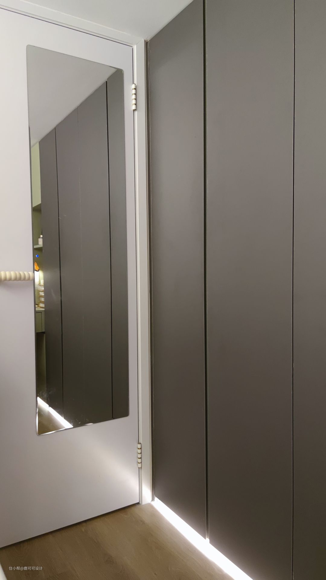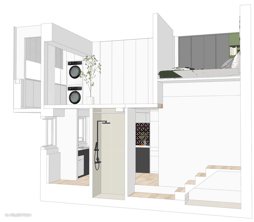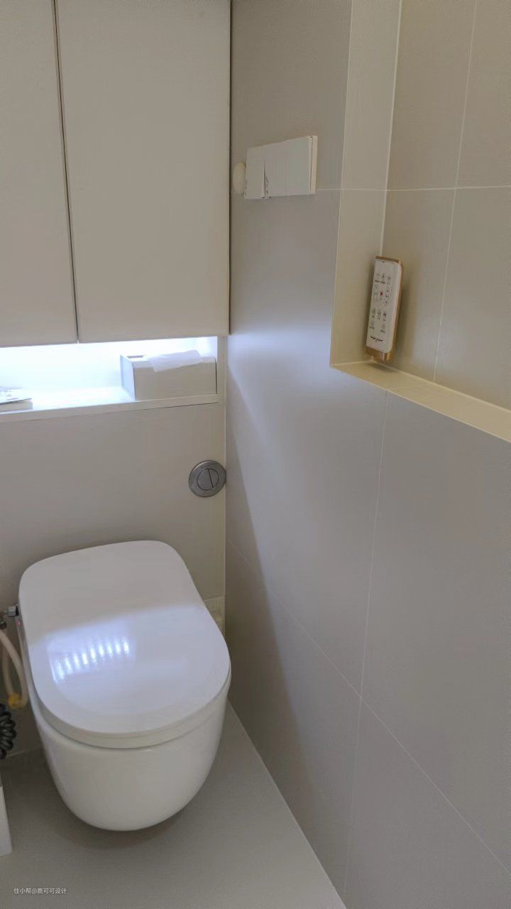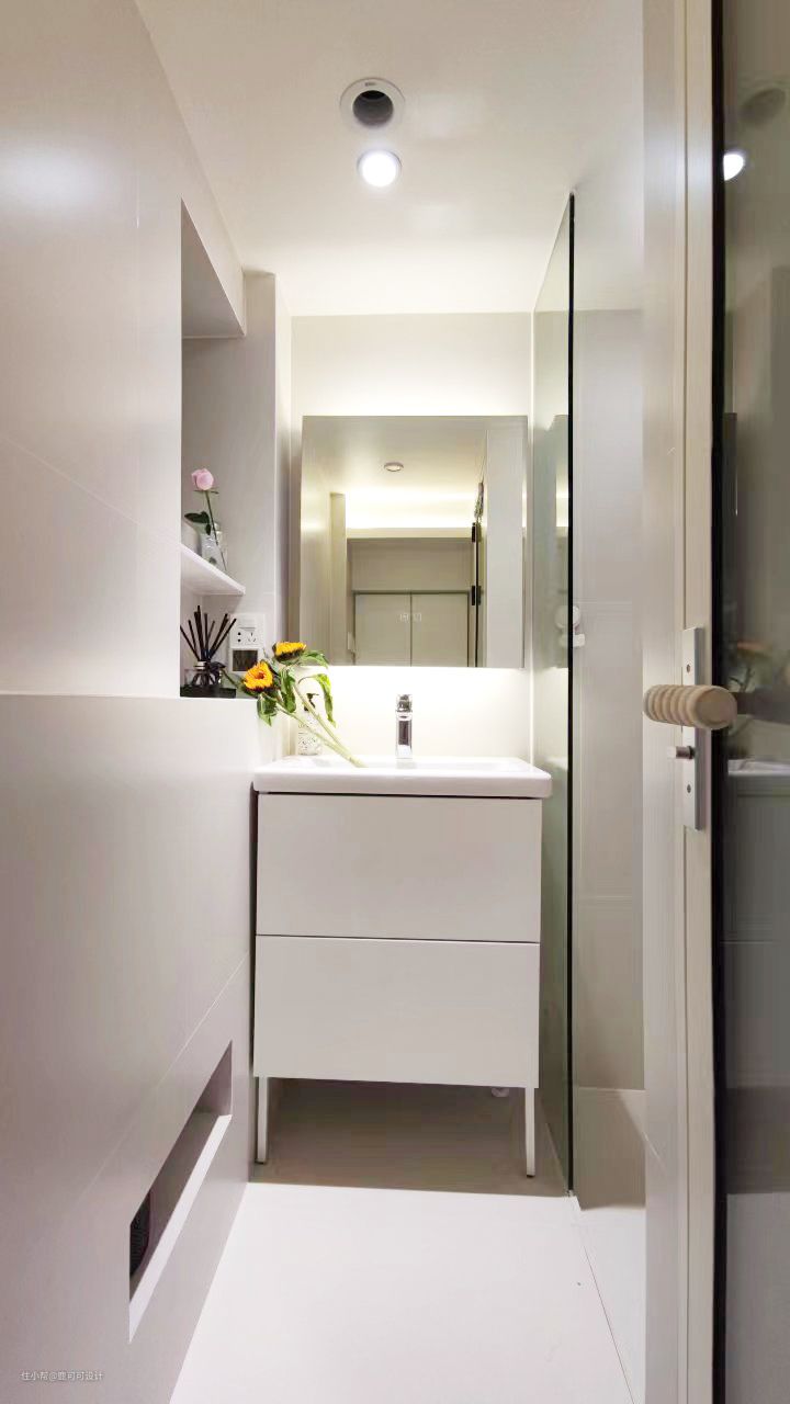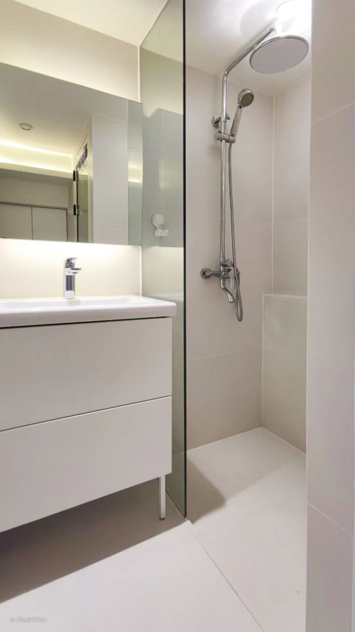 △公卫利用楼梯下的空间做了一个L形的布局,干湿分离。 整个公卫用了柔光奶白色的砖墙地对缝铺,铺砖师傅有强迫症,每一条对缝对齐了都会让他有满足感,妥妥的二代泥工,子承父业,心态很棒的一个匠人。 公卫还做了地暖,平时比较潮湿的时候可以开上,虽然在深圳,有些人是特别怕冷,屋主就是其中之一,哈哈哈,对于怕冷人士来说冬天有地暖就太幸福了。 △淋浴区做了下沉式设计,下沉20mm,不用做传统的隔断,简约好打理。 △除了镜柜与浴室柜,窗户位置还做了壁龛的设计,平时的一些护肤品常用的就可以放在这里,顺手拿。 △屋主说马桶上方的柜子里面可以囤2~3箱的纸巾,每次买纸可以买5箱,楼下放三箱,楼上的阳台柜放2箱。收纳做好了,每次都会感慨这个小家是真能装。