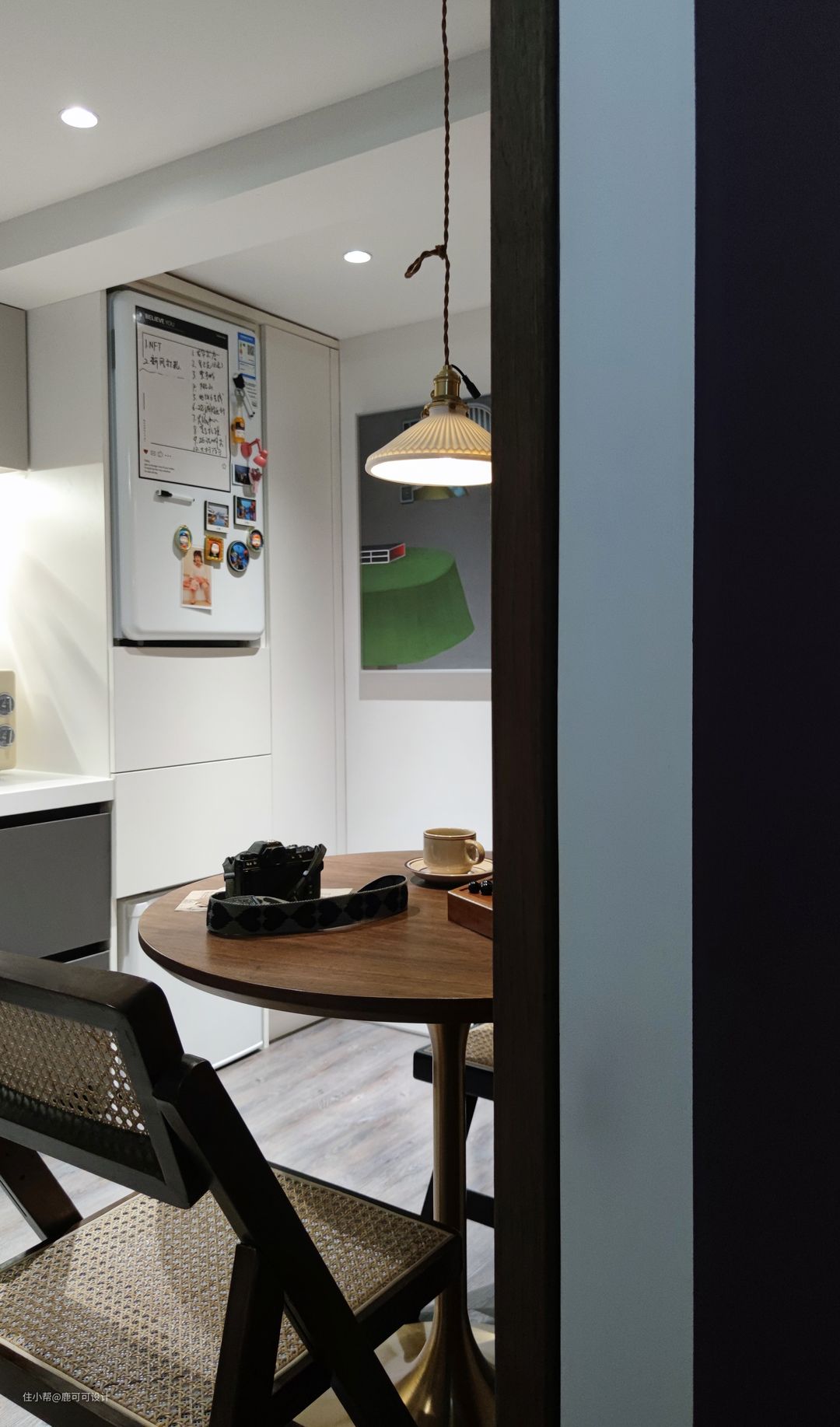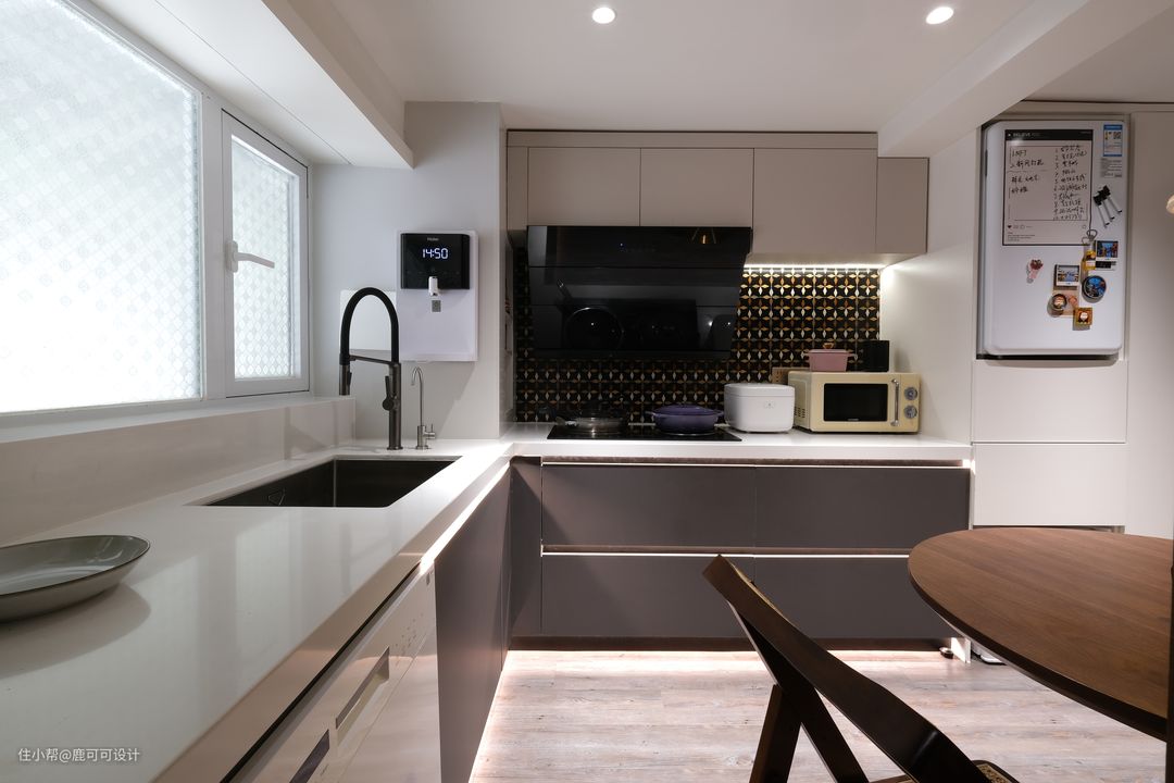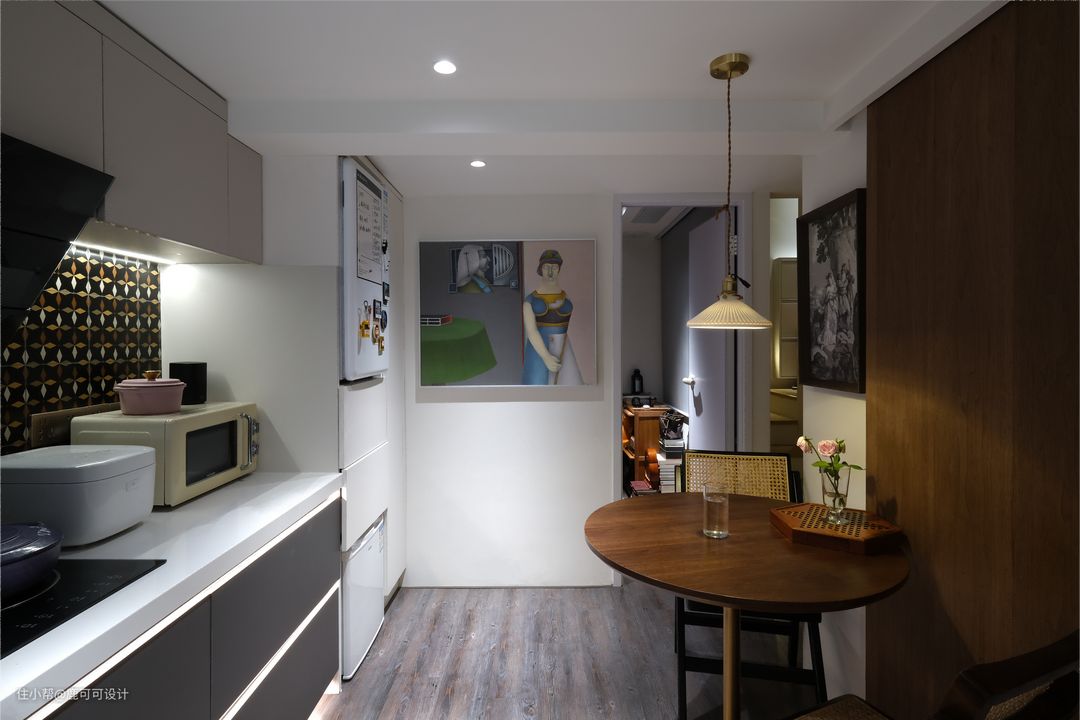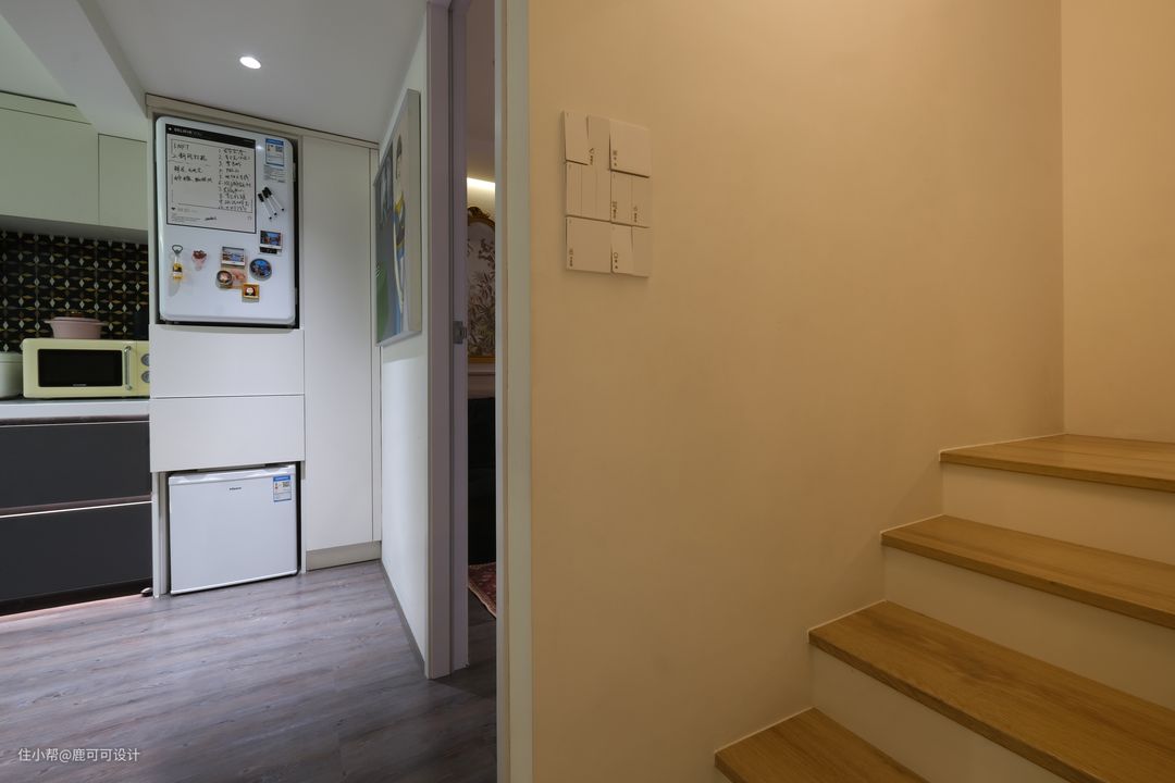 △餐厨空间偏艺术轻复古风,墙面是常见的白色,地面用了特别的偏灰调混木色,同时融入了一些复古的胡桃木元素,整个空间巧妙的平衡了深色与浅色,复古与现代的过渡。 △对称空间的美感,橱柜与吊柜中间的小花砖选了好久,小花砖是美拉德的暖调渐变过渡色,一片片棱角分明,铺贴完又组合成一个个圆,给整个空间晕染上了一份精致感,神秘感。 △小户型的收纳能利用好垂直空间很关键,生活中,有人喜欢囤很多的菜,有的人就喜欢只买这一两天的菜,保持菜的新鲜。 像屋主YY就不喜欢囤太多的菜,除了新鲜还有个点就是不会每天都在家里下厨,平时只有朋友来玩聚餐的时候用厨房比较多,所以不需要太大的冰箱。根据屋主的生活习惯,一楼的冰箱分成上下两个,中间两个大的抽屉,一些干货就可以在这里补充收纳。而用的最少的冷藏则放在最底层。 △屋主发的一些聚餐时的图,鹿可可团队有幸被邀请过很多次。餐厨一体,大家一起动手择菜,切菜,边打下手边聊天,也很解压。 家常便饭,平常的小事,成为了瞬间的美好,永恒的回忆。