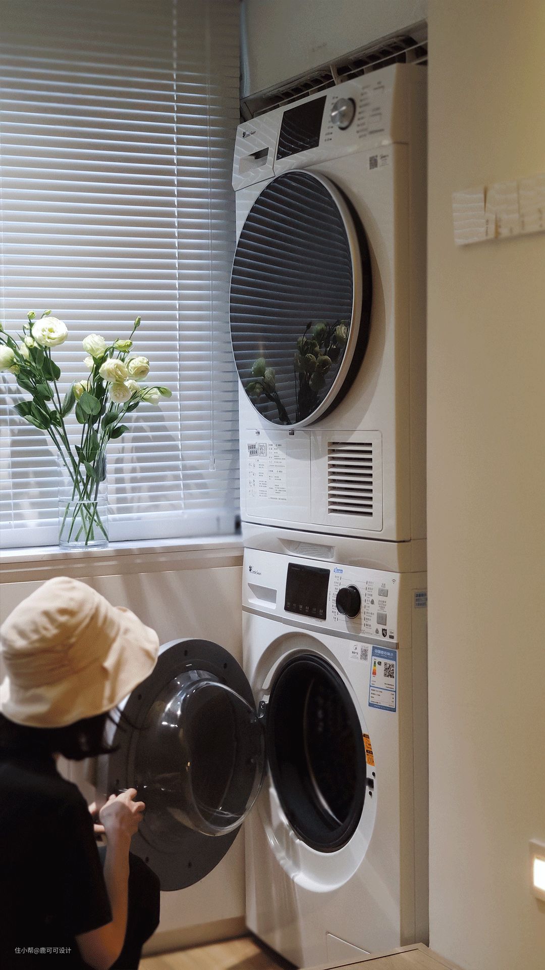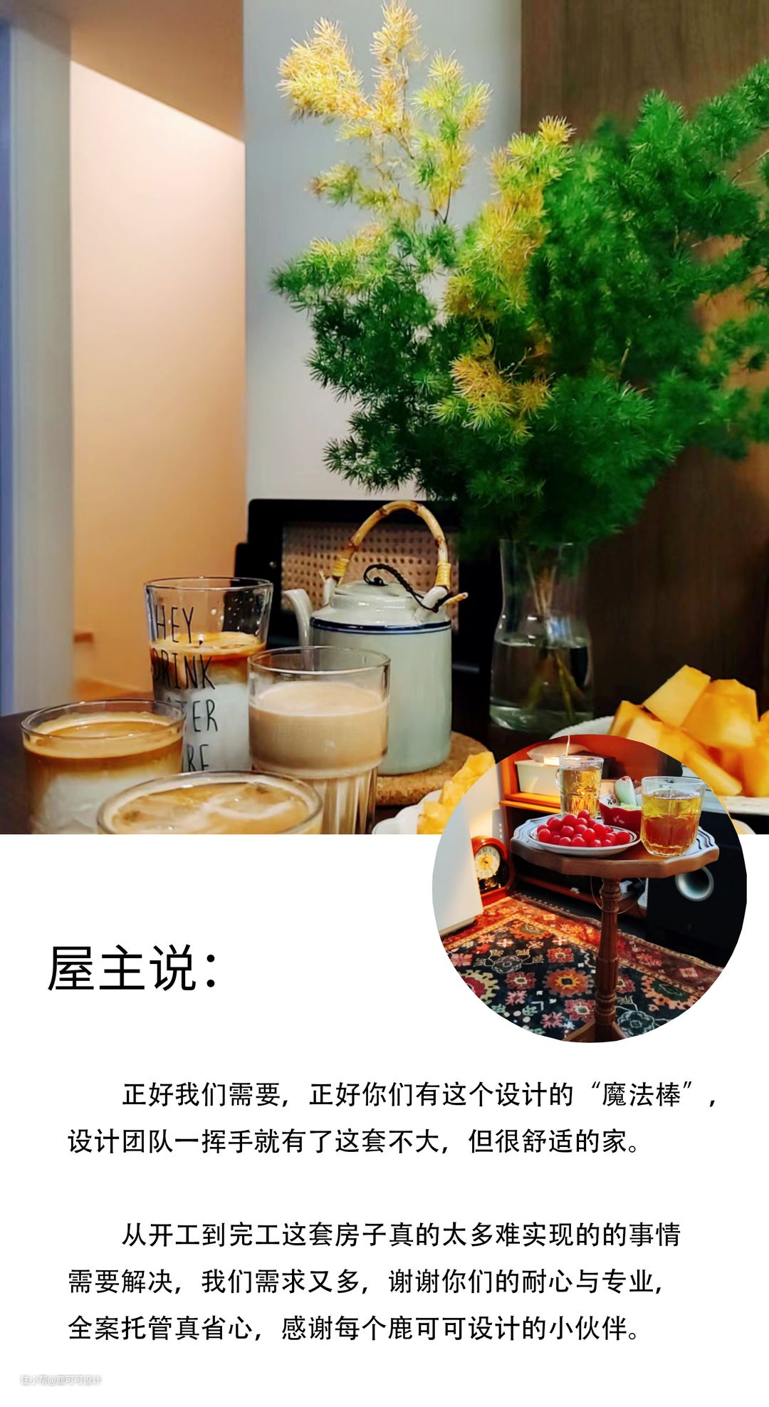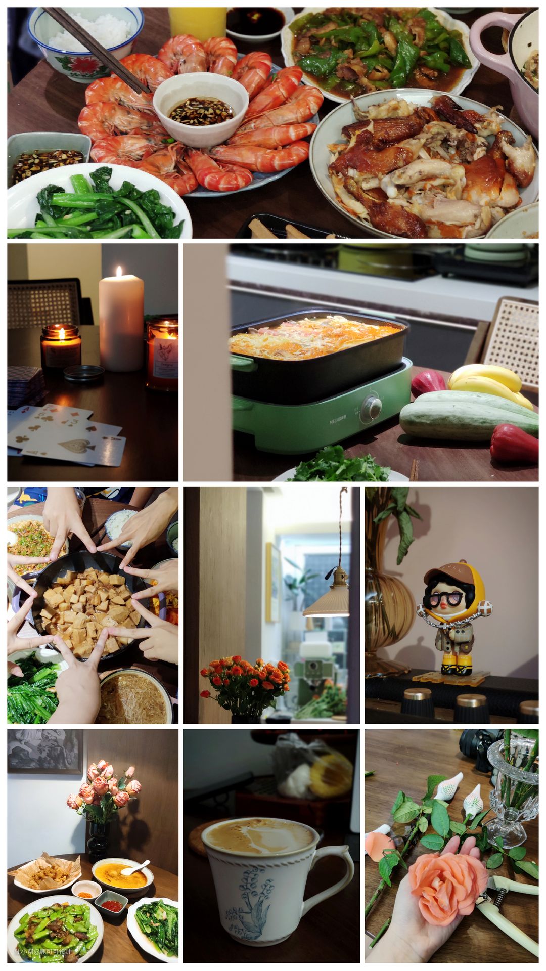 △餐厨空间偏艺术轻复古风,墙面是常见的白色,地面用了特别的偏灰调混木色,同时融入了一些复古的胡桃木元素,整个空间巧妙的平衡了深色与浅色,复古与现代的过渡。 △对称空间的美感,橱柜与吊柜中间的小花砖选了好久,小花砖是美拉德的暖调渐变过渡色,一片片棱角分明,铺贴完又组合成一个个圆,给整个空间晕染上了一份精致感,神秘感。 △小户型的收纳能利用好垂直空间很关键,生活中,有人喜欢囤很多的菜,有的人就喜欢只买这一两天的菜,保持菜的新鲜。 像屋主YY就不喜欢囤太多的菜,除了新鲜还有个点就是不会每天都在家里下厨,平时只有朋友来玩聚餐的时候用厨房比较多,所以不需要太大的冰箱。根据屋主的生活习惯,一楼的冰箱分成上下两个,中间两个大的抽屉,一些干货就可以在这里补充收纳。而用的最少的冷藏则放在最底层。 △屋主发的一些聚餐时的图,鹿可可团队有幸被邀请过很多次。餐厨一体,大家一起动手择菜,切菜,边打下手边聊天,也很解压。 家常便饭,平常的小事,成为了瞬间的美好,永恒的回忆。