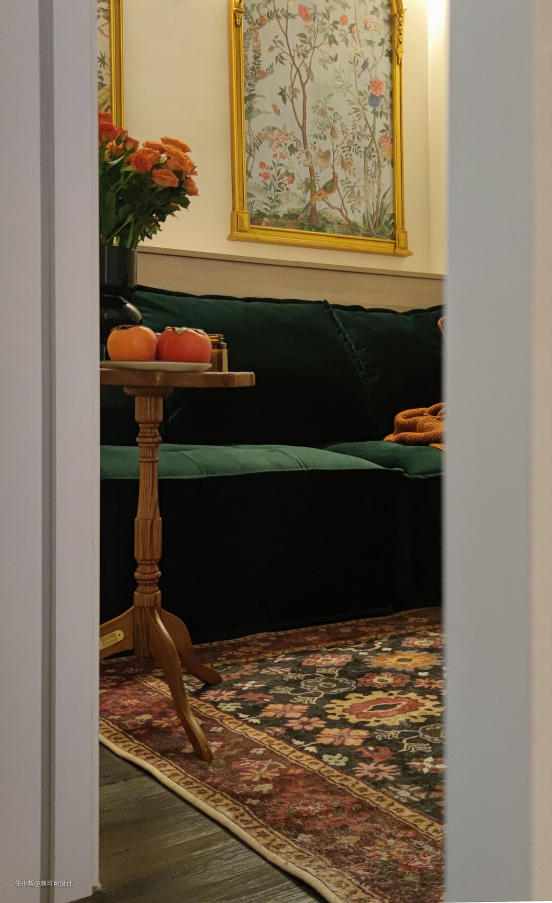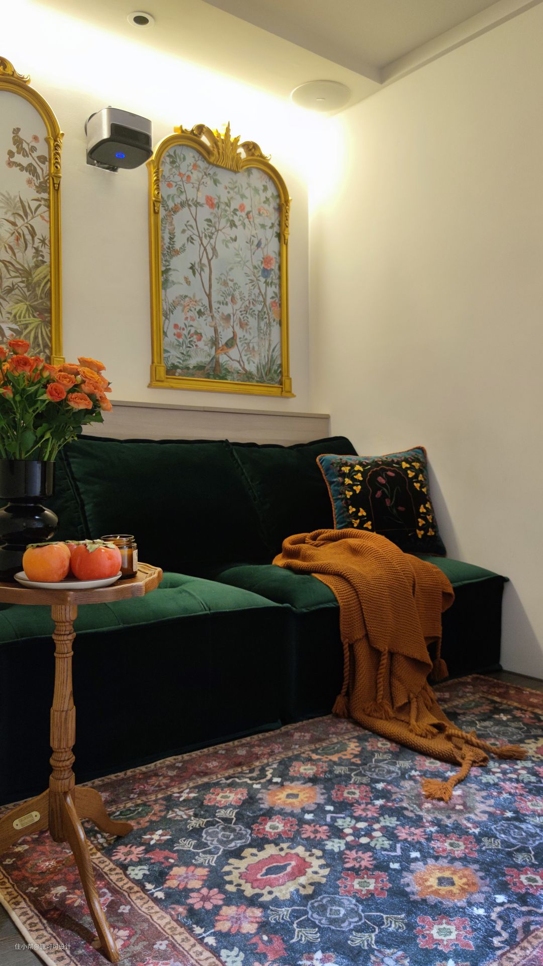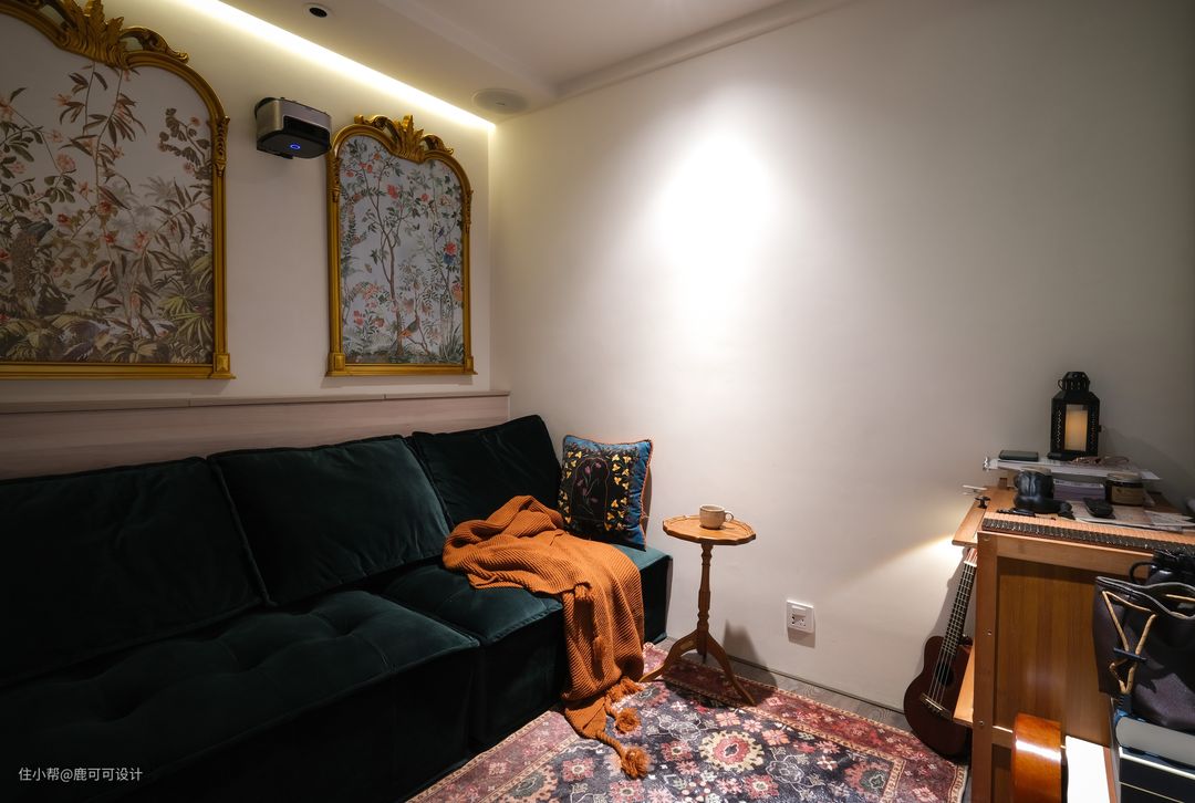 △看电影是屋主的爱好之一,居家有闲暇时间经常会重温一些经典的电影。设计之初就提出了想在家里内嵌一套雅马哈音响,音响内嵌在天花。 △多功能次卧定制了宽900mm的豆腐块沙发,坐感舒适,躺下来的感觉也不错,亲戚朋友偶尔留宿可以用到。 △通常来说只有关系很铁的朋友才会在家留宿,如果有两个人,打个地铺也是不错的。一个睡沙发,一个睡地毯。 △绿丝绒质感的沙发,在这个小空间里非常亮眼,提神。搭配墙上两幅金色雕花画框的工笔画,让空间充满精致的浪漫感。