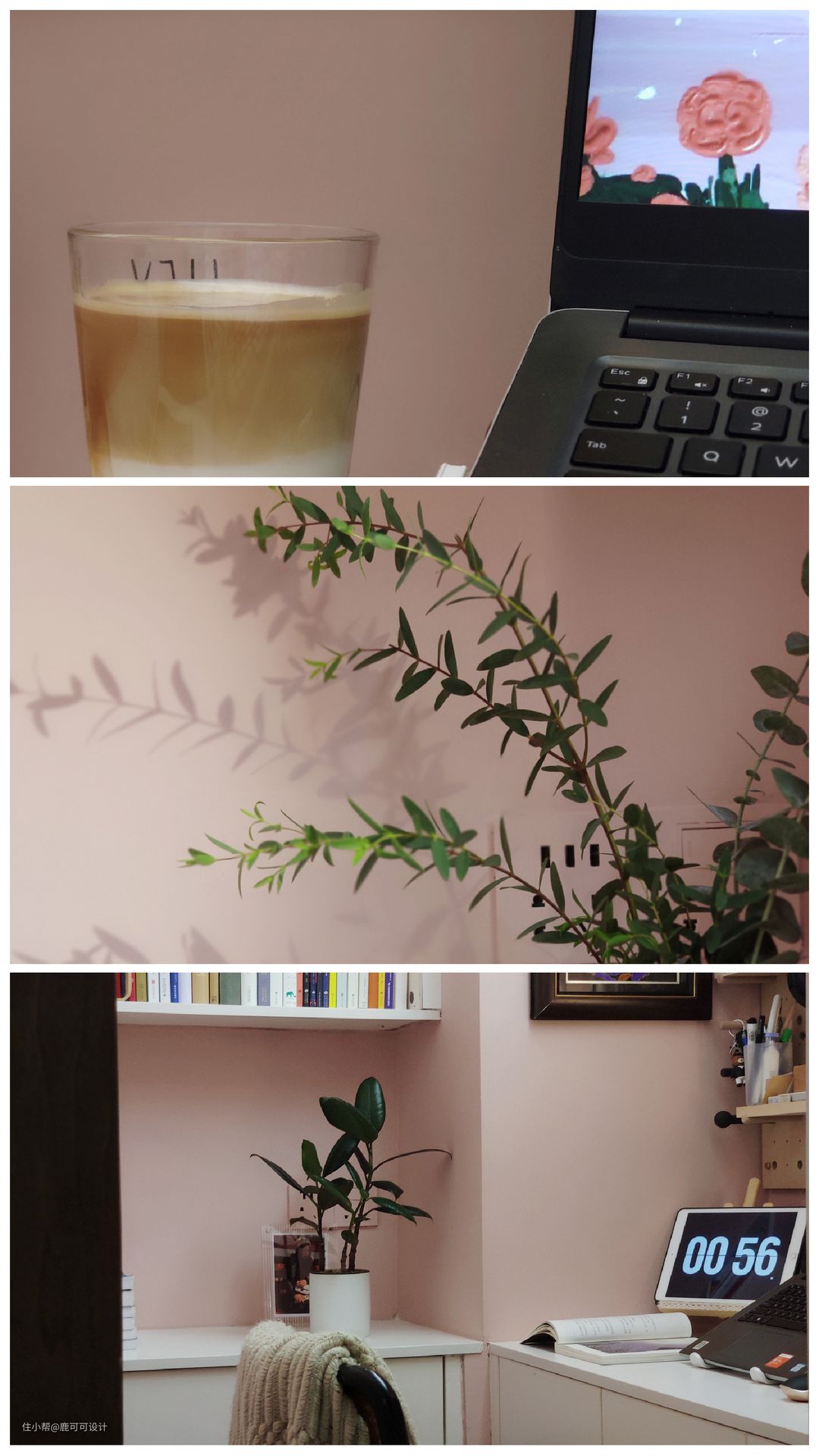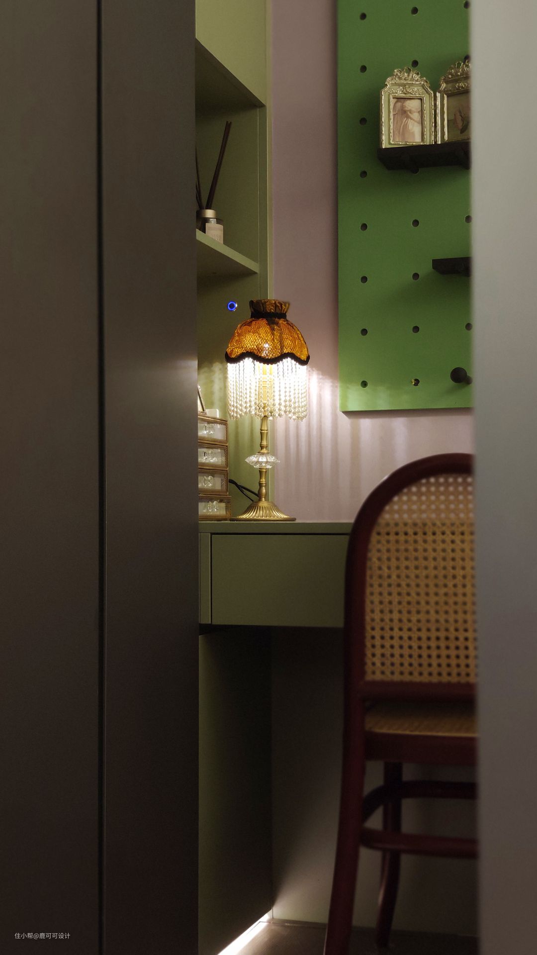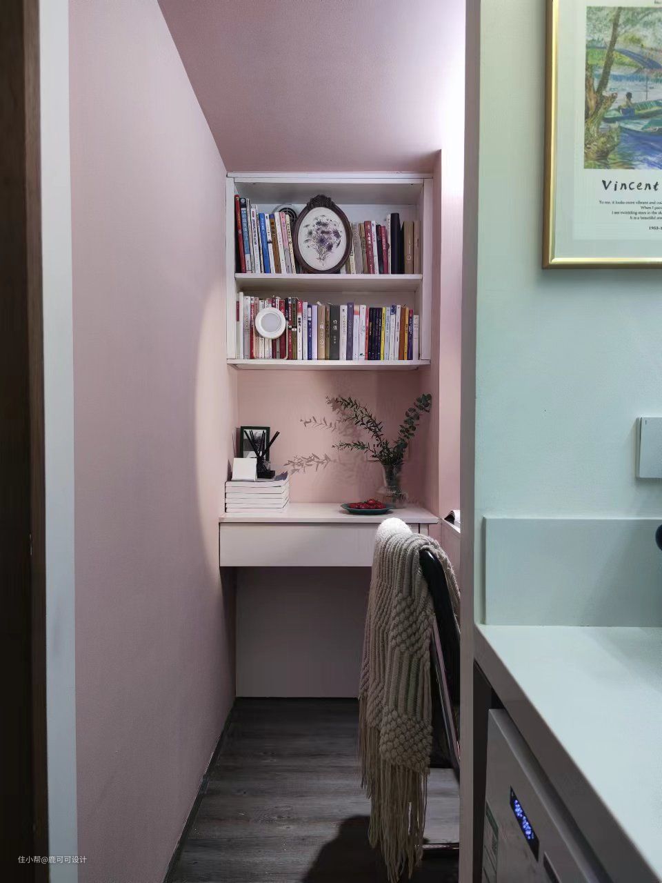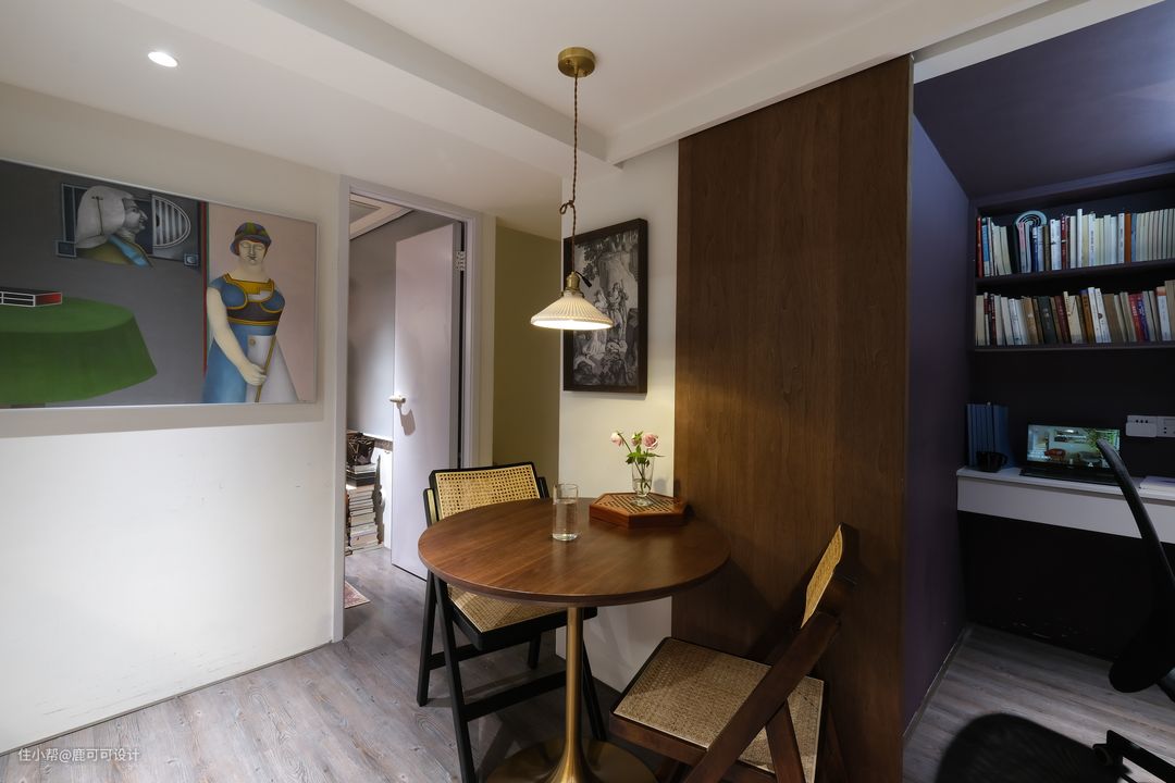△书房原本是男屋主使用,一开始设计的是深紫色的一个比较神秘的颜色,后面计划有变,反而是女屋主使用的频率比较高,我们重新为这个小书房根据女屋主的喜好设计了烟灰粉,一个甜而不腻的温柔安静的书房空间氛围就打造出来了。 △小书房面积不大,主打一个精致美如画。一个属于自己的书房,关上门可以与世隔绝做自己的创作是每一个自由职业者都喜欢的吧~ 书房的门是一个复古推拉门,硬装木工的时候提前预埋了轨道,安装后是一扇实用的装饰门。