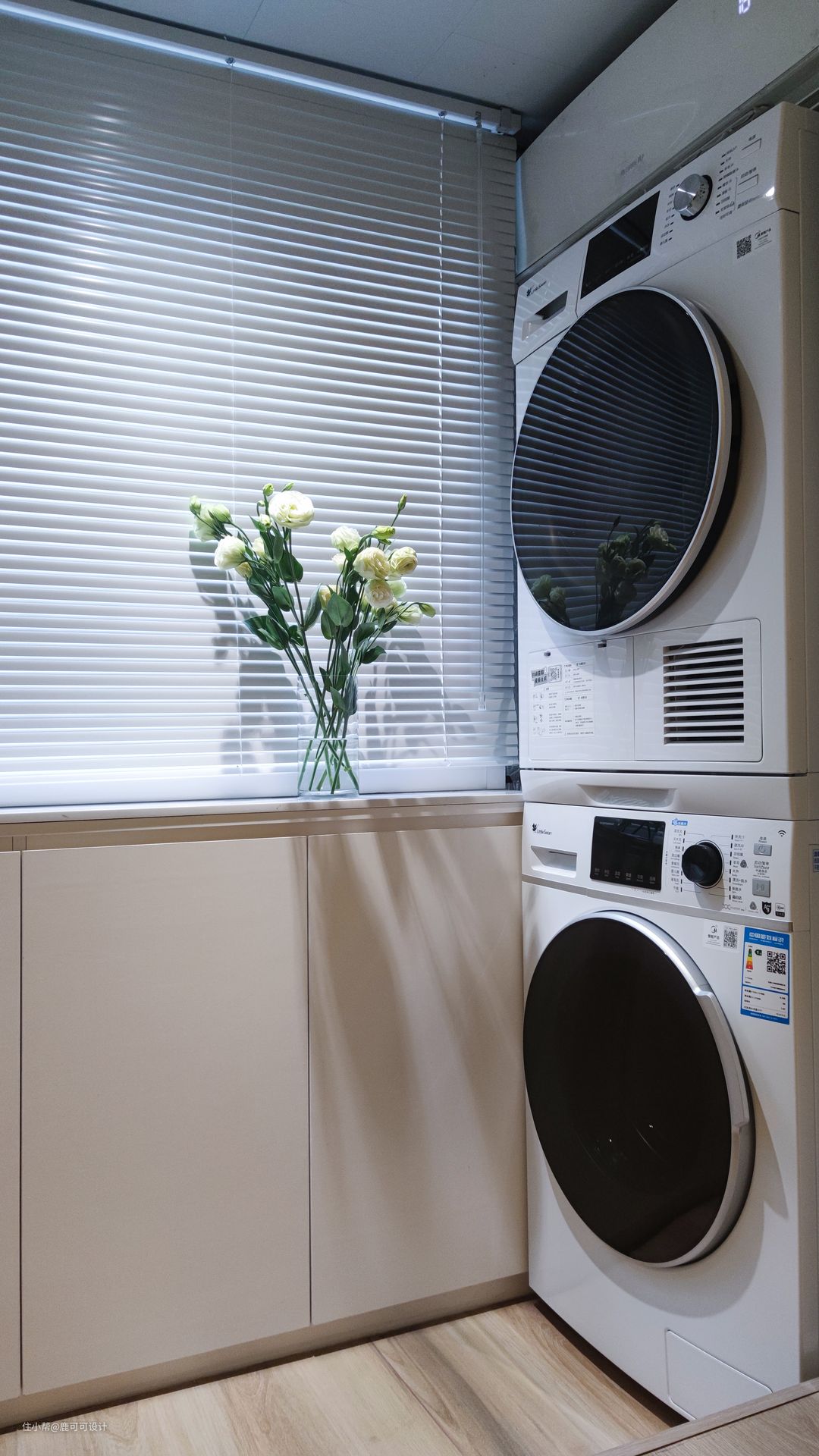 △这个客厅小阳台是外扩的一个小空间,洗衣机叠烘干机很巧妙的放在这个位置,上方还安装了空调,视觉上融合的很整齐。 侧面设计了一排宽度170mm的定制矮柜,生活用品类与洗护用品都在此补充收纳。 △下沉式的内阳台地面铺贴了与客厅同色调的木纹砖,有水区域,用砖妥妥的首选。
