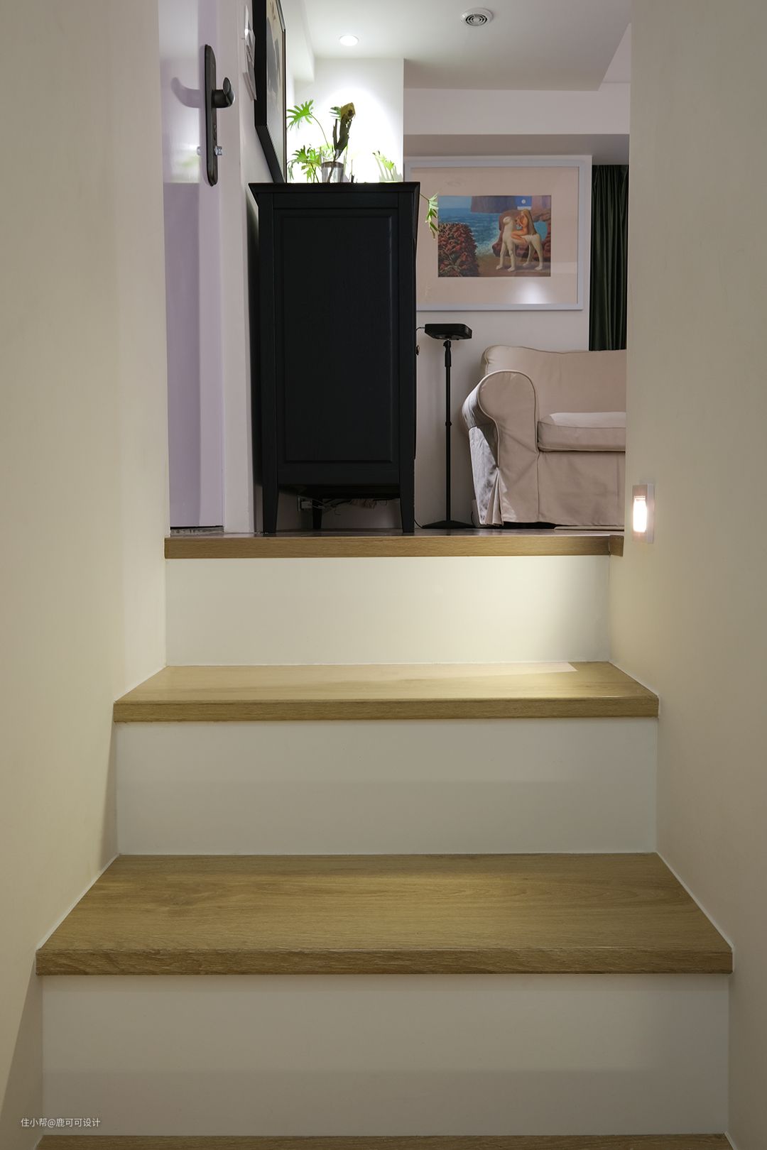 △楼梯利用最少的面积建立舒适,安全的上下通道,楼梯做的是钢结构,木板打底,最上面一层是定制的实木踏步,脚感舒适防滑。白色基调搭配原木色,一回家迎面就是温馨的楼梯空间。 △小朋友来家里玩都很喜欢在楼梯里坐着,看绘本,玩乐高。