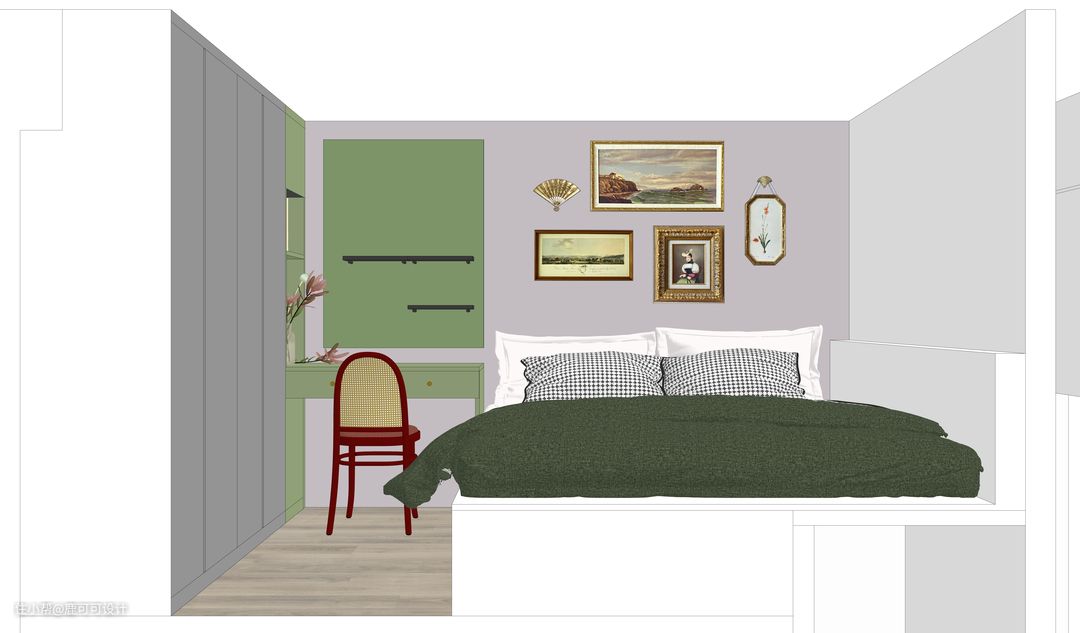 △主卧的设计用了屋主比较喜欢的紫色与绿色,梦幻色彩的相撞,清爽的浪漫。 △洞洞板是团队小伙伴一起动手参与刷色的,哑光橄榄绿配黑色的火柴棍,活动层板可以自由组合,随心情与喜好摆放手办与旅游带回来的小纪念品。 床定制了榻榻米,这里有个巧妙的点,1800mm的床,有800mm的宽度是下楼梯的顶部,错层利用空间。 让这个仅有6.5㎡的卧室有梳妆台、衣柜、1.8米的床,还有3个可以完全拉出来的抽屉式收纳柜。 △背景是浅紫色的墙漆,鲜切的粉色玫瑰,这种甜蜜色彩的相撞直戳心巴,家人们,谁懂啊! △主卧门后面直接贴了面实用的镜子,不占用衣柜的空间,站的远照镜子可以照到全身。