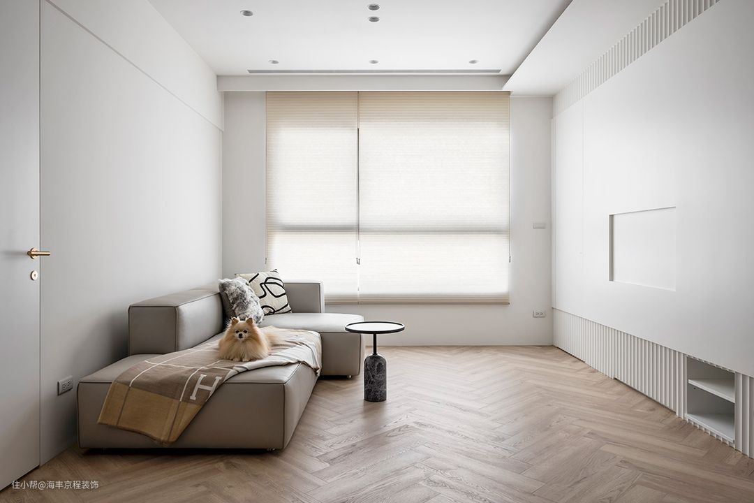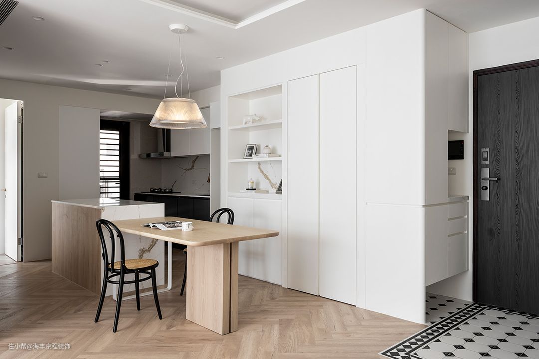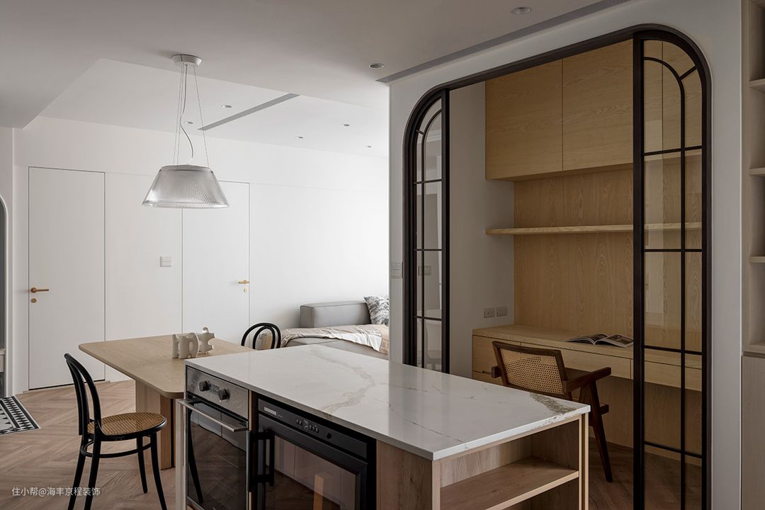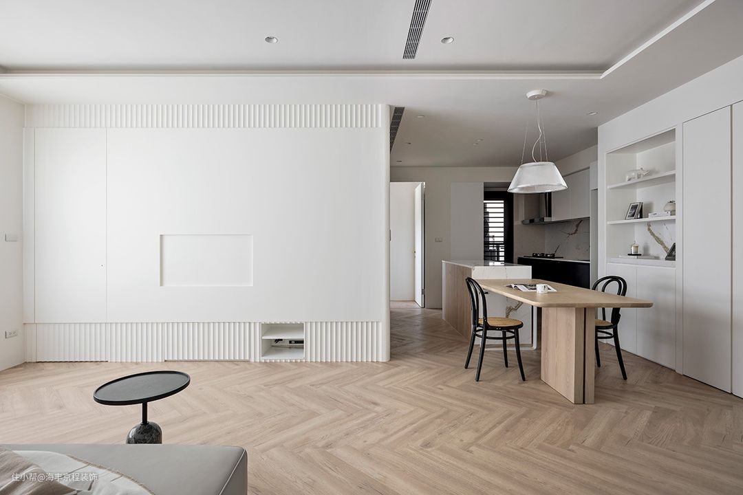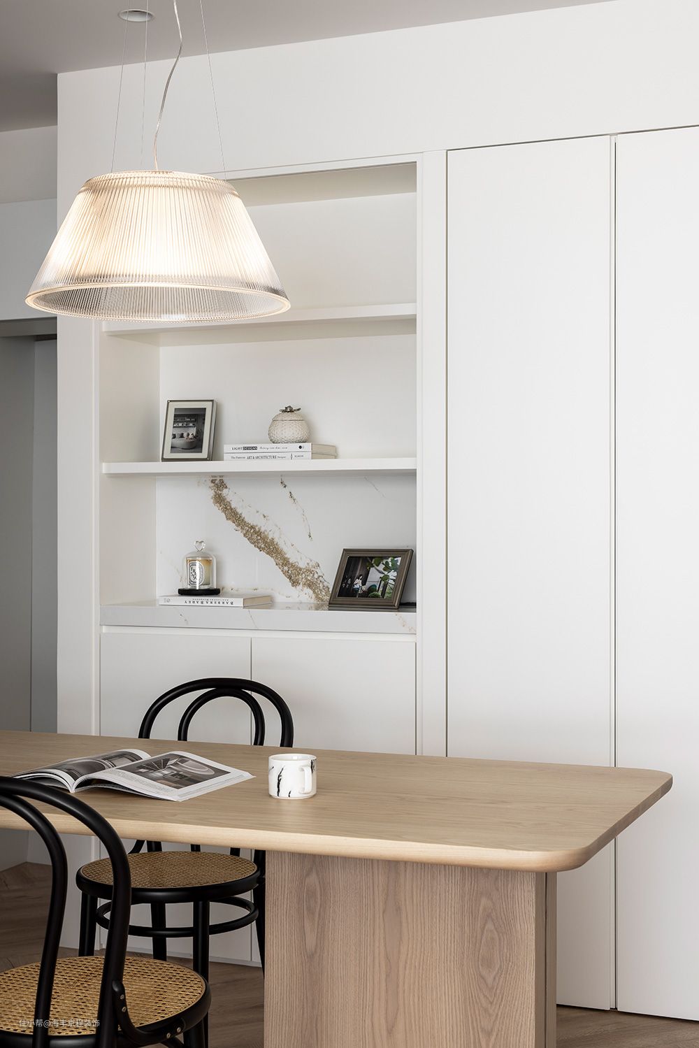 Q:如何放大坪效感? 「因为面积有限,只要将动线精心收折,就能消弭各个角落的零碎区块,我们在转角处,全都刻意导圆弧角,同时打造内凹式柜体,降低厚沉量体感,也就少了边棱交界,即能还原场域完整轮廓,真正放大了每一寸空间感。」 别于多数居宅,常将主景形塑于客厅,本室将一踏入家门的视觉,落在餐厅、厨房、书房三域,客厅让渡出每一寸净白肌理与日光相衬,形如纯然通透,使得高楼层映入风与光,能缓缓洒入一地,即释放更多空间感。 因本案为预售屋购入,毛坯状态进行装修,落下一道道隔间墙时,便细细度量平配尺度,更须依据全新建筑法规,顾及楼板隔音棉铺设,又因现行工法与以往大为不同,提高了施工难度,都凸显了设计团队不仅善于勾勒美感,施作工程亦极为专业,以刚柔并济笔调,铺写了美好家景。