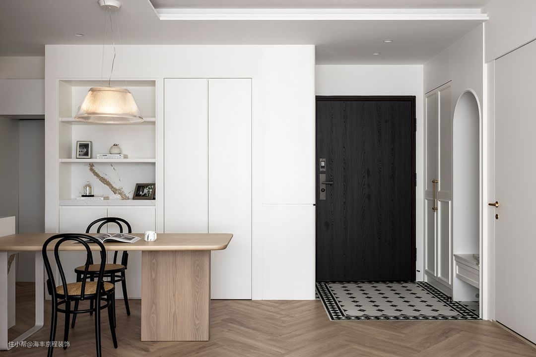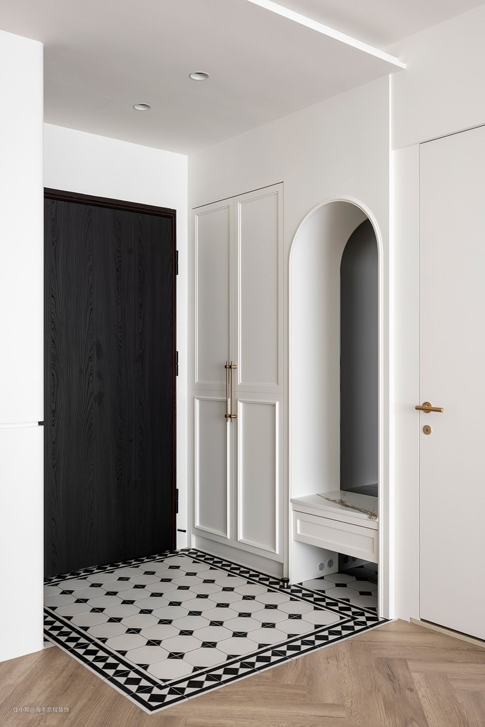 一幕幕入门即景,将在步履周折入内时,因为柔调色彩搭衬,使玄关幻化为转换心境之处,在经典黑白菱格纹地砖摊展下,轻盈步伐让回家心绪缓为沉稳,再由一道圆拱顶造型,塑为穿鞋椅,为全室轻揭着小法式节奏,慢慢漾开来。